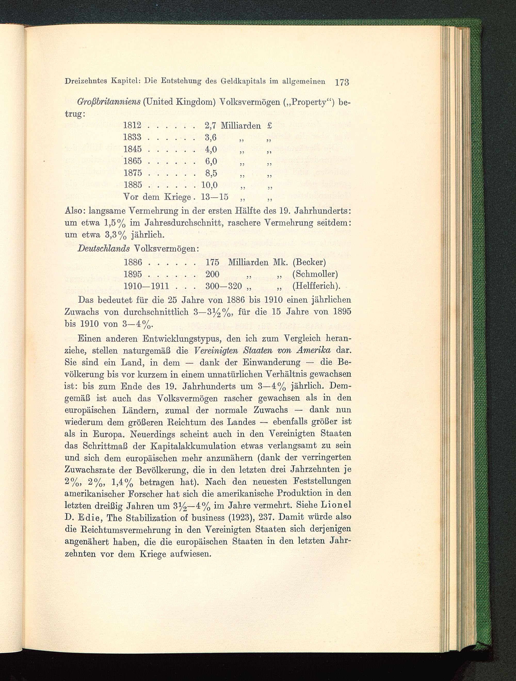 Einen anderen Entwicklungstypus, den ich zum Vergleich heran-ziehe, stellen naturgemäß die Vereinigten Staaten von Amerika dar.Sie sind ein Land, in dem — dank der Einwanderung — die Be-völkerung bis vor kurzem in einem unnatürlichen Verhältnis gewachsenist: bis zum Ende des 19. Jahrhunderts um 3—4% jährlich. Dem-gemäß ist auch das Volksvermögen rascher gewachsen als in deneuropäischen Ländern, zumal der normale Zuwachs — dank nunwiederum dem größeren Reichtum des Landes — ebenfalls größer istals in Europa. Neuerdings scheint auch in den Vereinigten Staaten das Schrittmaß der Kapitalakkumulation etwas verlangsamt zu seinund sich dem europäischen mehr anzunähem (dank der verringertenZuwachsrate der Bevölkerung, die in den letzten drei Jahrzehnten je2%, 2%, 1,4% betragen hat). Nach den neuesten Feststellungenamerikanischer Forscher hat sich die amerikanische Produktion in denletzten dreißig Jahren um 3%.—4% im Jahre vermehrt. Siehe LionelD. Edie, The Stabilization of business (1923), 237. Damit würde alsodie Reichtumsvermehrung in den Vereinigten Staaten sich derjenigenangenähert haben, die die europäischen Staaten in den letzten Jahr-zehnten vor dem Kriege aufwiesen.