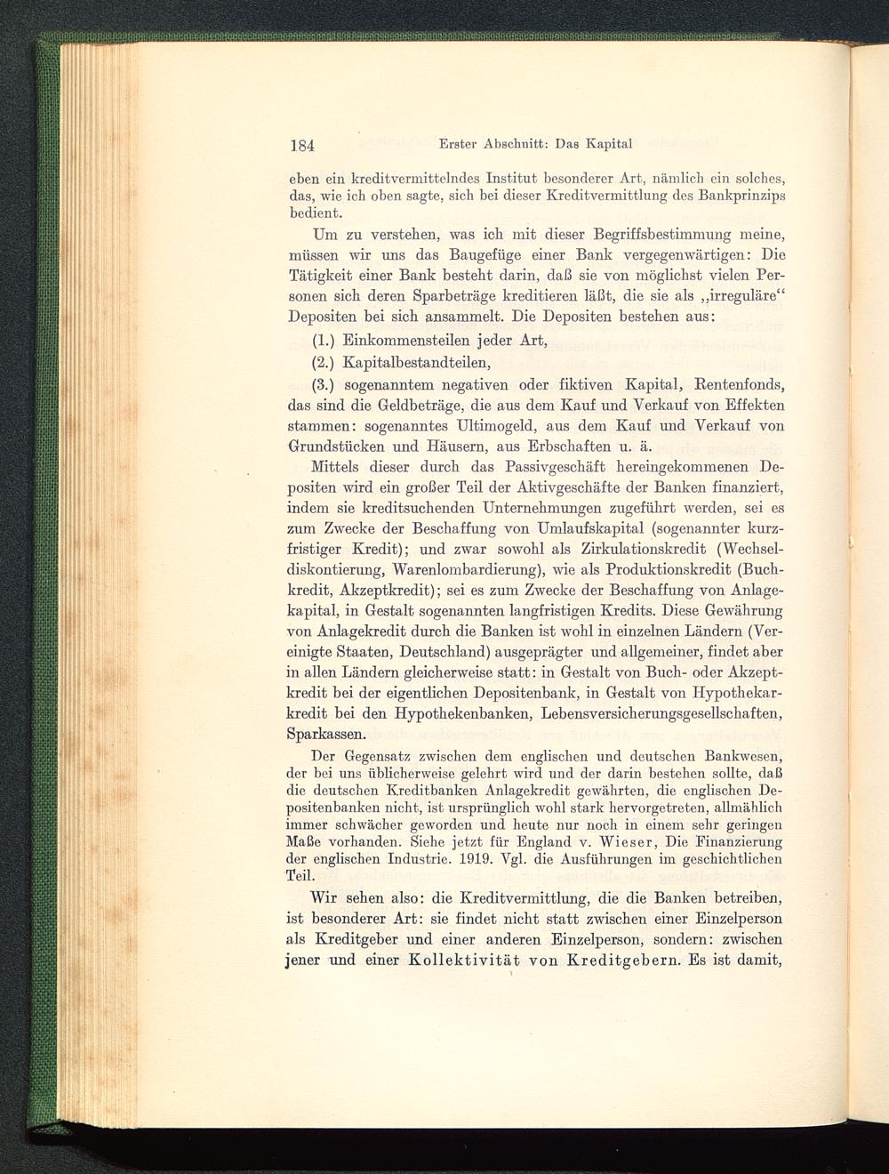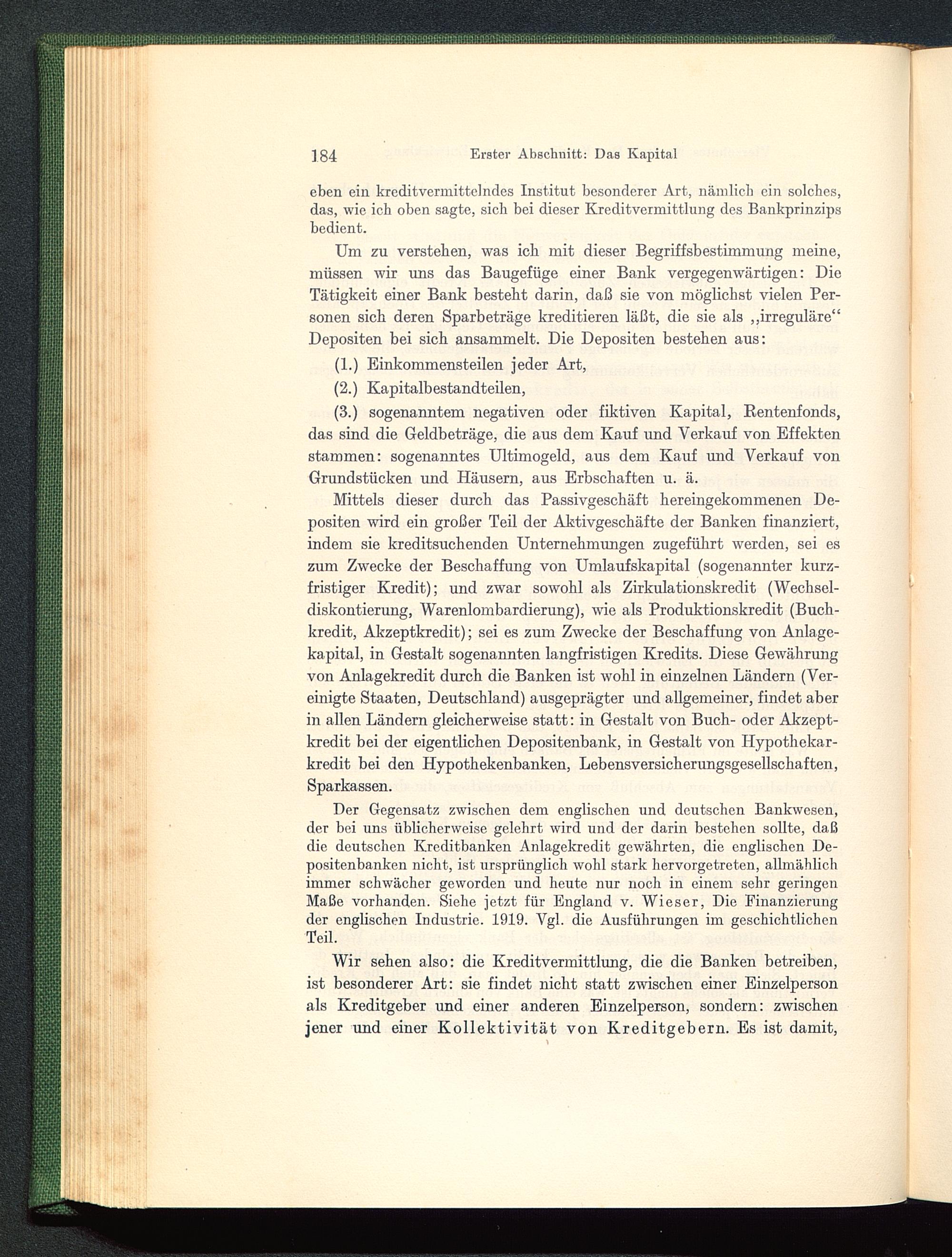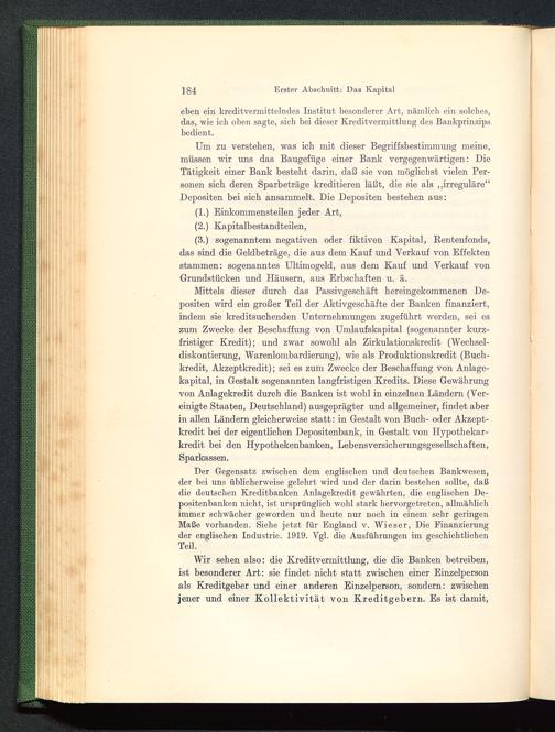 Mittels dieser durch das Passivgeschäft hereingekommenen De-positen wird ein großer Teil der Aktivgeschäfte der Banken finanziert,indem sie kreditsuchenden Unternehmungen zugeführt werden, sei eszum Zwecke der Beschaffung von Umlaufskapital (sogenannter kurz-fristiger Kredit); und zwar sowohl als Zirkulationskredit (Wechsel-diskontierung, Warenlombardierung), wie als Produktionskredit (Buch-kredit, Akzeptkredit); sei es zum Zwecke der Beschaffung von Anlage-kapital, in Gestalt sogenannten langfristigen Kredits. Diese Gewährungvon Anlagekredit durch die Banken ist wohl in einzelnen Ländern (Ver-einigte Staaten, Deutschland ) ausgeprägter und allgemeiner, findet aberin allen Ländern gleicherweise statt: in Gestalt von Buch- oder Akzept-kredit bei der eigentlichen Depositenbank, in Gestalt von Hypothekar-kredit bei den Hypothekenbanken, Lebensversicherungsgesellschaften,Sparkassen.