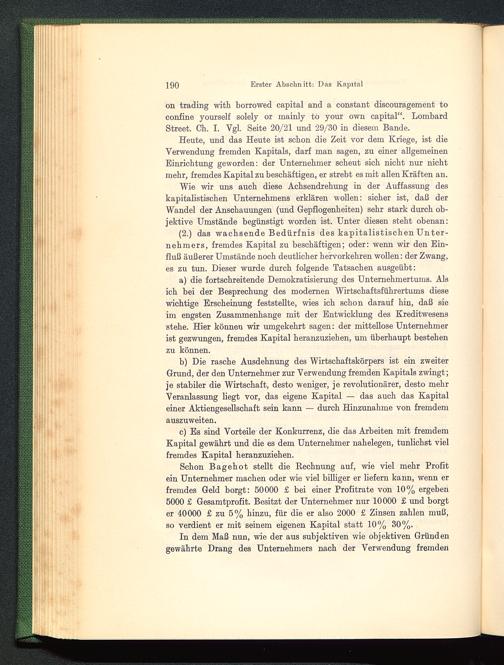 Schon Bagehot stellt die Rechnung auf, wie viel mehr Profitein Unternehmer machen oder wie viel billiger er liefern kann, wenn erfremdes Geld borgt: 50000 £ bei einer Profitrate von 10% ergeben5000 £ Gesamtprofit. Besitzt der Unternehmer nur 10000 £ und borgter 40000 £ zu 5% hinzu, für die er also 2000 £ Zinsen zahlen muß,so verdient er mit seinem eigenen Kapital statt 10% 30%.
