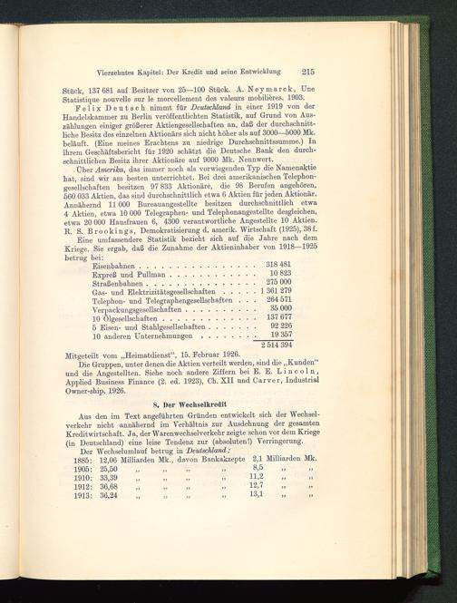 Die Gruppen, unter denen die Aktien verteilt werden, sind die „Kunden“und die Angestellten. Siehe noch andere Ziffern bei E. E. Lincoln,Applied Business Finance (2. ed. 1923), Ch. XII und Carver, IndustrialOwner-ship. 1926.