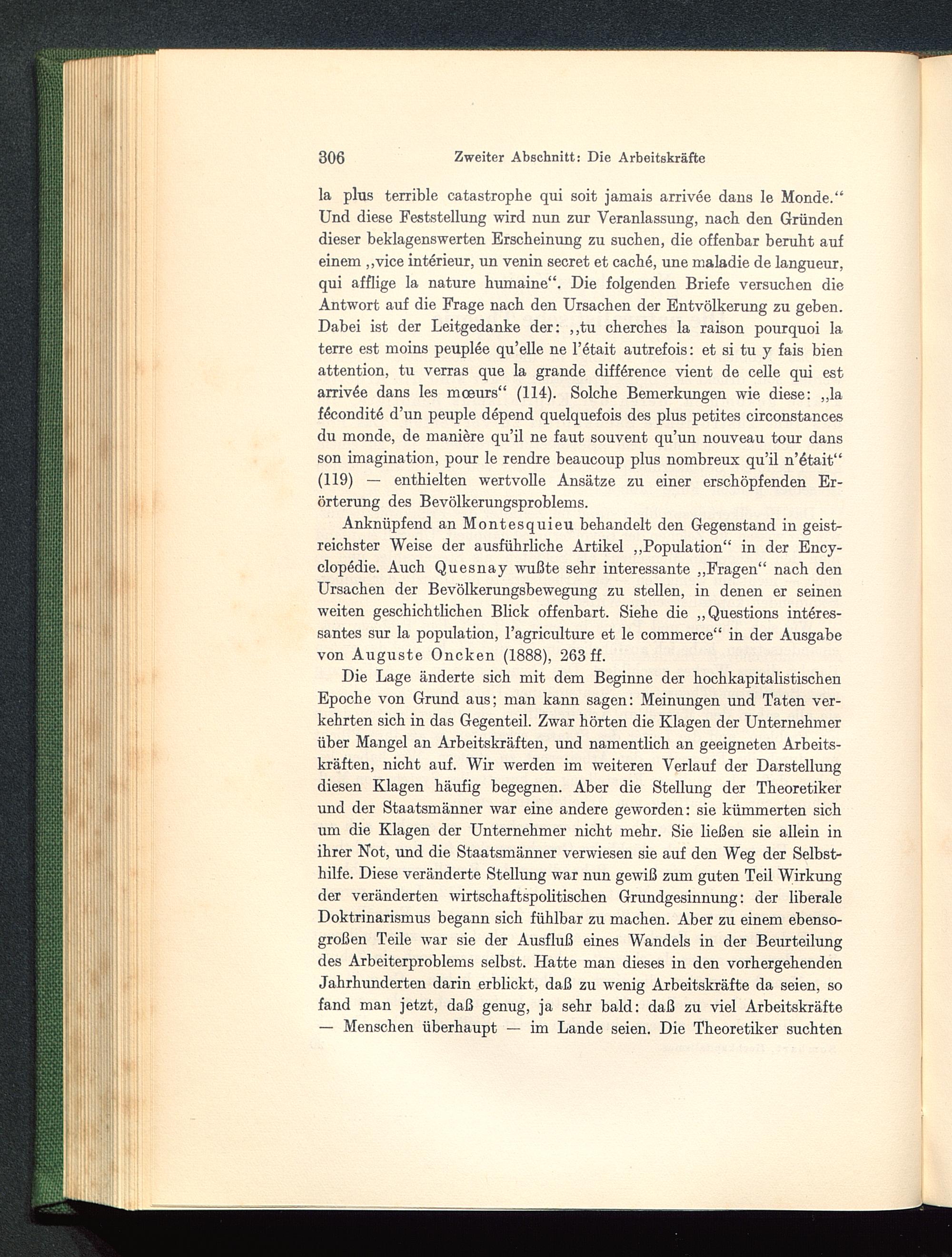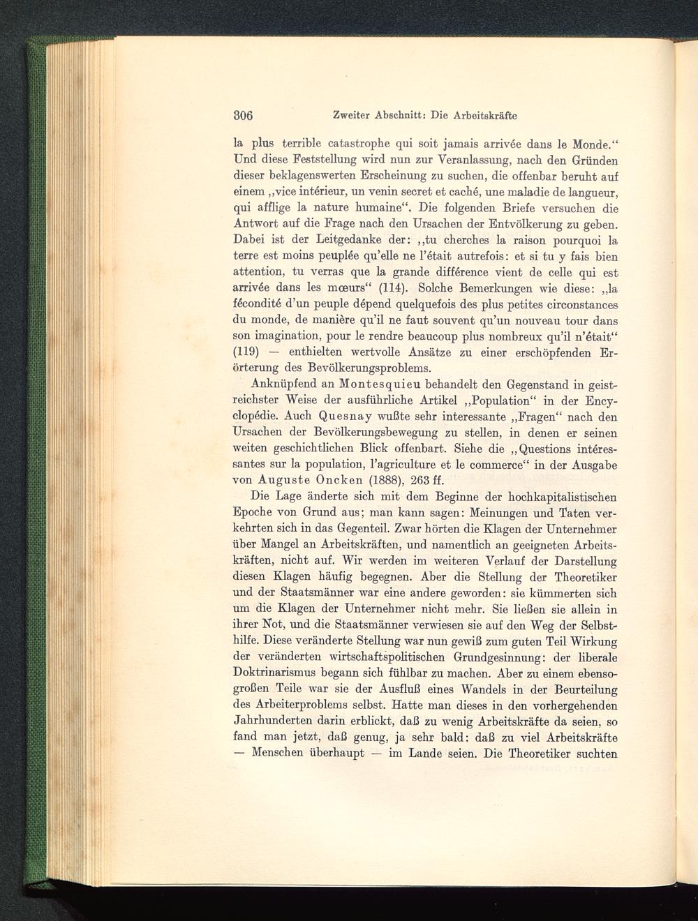 Anknüpfend an Montesquieu behandelt den Gegenstand in geist-reichster Weise der ausführliche Artikel „Population“ in der Ency-clopedie. Auch Quesnay wußte sehr interessante „Fragen“ nach denUrsachen der Bevölkerungsbewegung zu stellen, in denen er seinenweiten geschichtlichen Blick offenbart. Siehe die „Questions interes-santes sur la population, l’agriculture et le commerce“ in der Ausgabevon Auguste Oncken (1888), 263 ff.