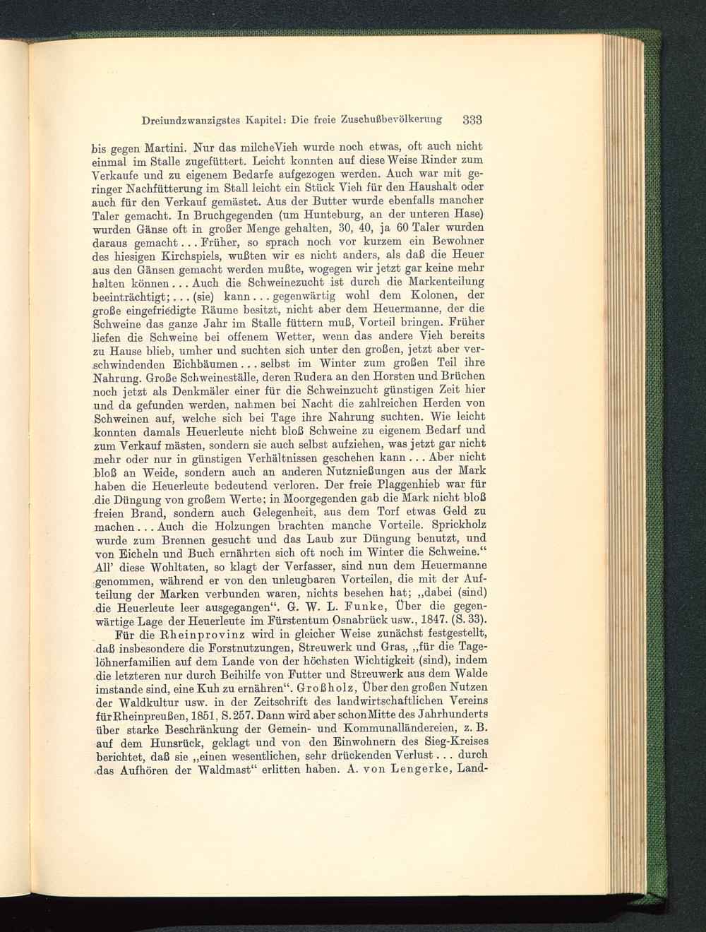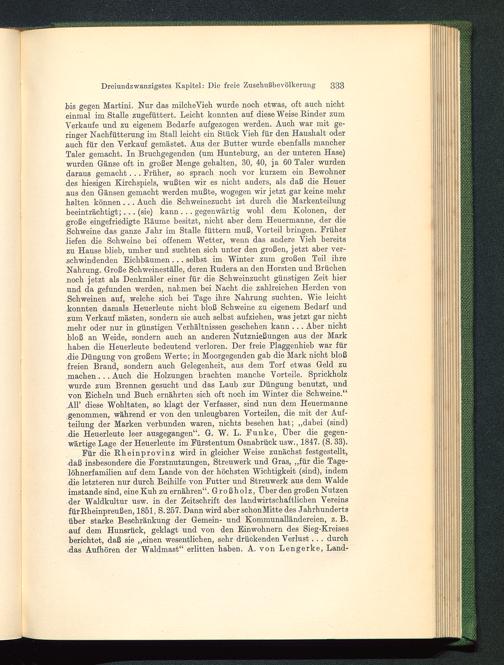 bis gegen Martini. Nur das milcheVieh wurde noch etwas, oft auch nichteinmal im Stalle zugefüttert. Leicht konnten auf diese Weise Rinder zumVerkaufe und zu eigenem Bedarfe aufgezogen werden. Auch war mit ge-ringer Nachfütterung im Stall leicht ein Stück Vieh für den Haushalt oderauch für den Verkauf gemästet. Aus der Butter wurde ebenfalls mancherTaler gemacht. In Bruchgegenden (um Hunteburg , an der unteren Hase)wurden Gänse oft in großer Menge gehalten, 30, 40, ja 60 Taler wurdendaraus gemacht. . . Früher, so sprach noch vor kurzem ein Bewohnerdes hiesigen Kirchspiels, wußten wir es nicht anders, als daß die Heueraus den Gänsen gemacht werden mußte, wogegen wir j etzt gar keine mehrhalten können. . . Auch die Schweinezucht ist durch die Markenteilungbeeinträchtigt; .. . (sie) kann . . . gegenwärtig wohl dem Kolonen, dergroße eingefriedigte Räume besitzt, nicht aber dem Heuermanne, der dieSchweine das ganze Jahr im Stalle füttern muß, Vorteil bringen. Früherliefen die Schweine bei offenem Wetter, wenn das andere Vieh bereitszu Hause blieb, umher und suchten sich unter den großen, jetzt aber ver-schwindenden Eichbäumen.. . selbst im Winter zum großen Teil ihreNahrung. Große Schweineställe, deren Rudera an den Horsten und Brüchennoch jetzt als Denkmäler einer für die Schweinzucht günstigen Zeit hierund da gefunden werden, nahmen bei Nacht die zahlreichen Herden vonSchweinen auf, welche sich bei Tage ihre Nahrung suchten. Wie leichtkonnten damals Heuerleute nicht bloß Schweine zu eigenem Bedarf undzum Verkauf mästen, sondern sie auch selbst aufziehen, was jetzt gar nichtmehr oder nur in günstigen Verhältnissen geschehen kann .. . Aber nichtbloß an Weide, sondern auch an anderen Nutznießungen aus der Markhaben die Heuerleute bedeutend verloren. Der freie Plaggenhieb war fürdie Düngung von großem Werte; in Moorgegenden gab die Mark nicht bloßfreien Brand, sondern auch Gelegenheit, aus dem Torf etwas Geld zumachen . . . Auch die Holzungen brachten manche Vorteile. Sprickholzwurde zum Brennen gesucht und das Laub zur Düngung benutzt, undvon Eicheln und Buch ernährten sich oft noch im Winter die Schweine.“All’ diese Wohltaten, so klagt der Verfasser, sind nun dem Heuermannegenommen, während er von den unleugbaren Vorteilen, die mit der Auf-teilung der Marken verbunden waren, nichts besehen hat; „dabei (sind)die Heuerleute leer ausgegangen“. G. W. L. Funke, Über die gegen-wärtige Lage der Heuerleute im Fürstentum Osnabrück usw., 1847. (S. 33).
