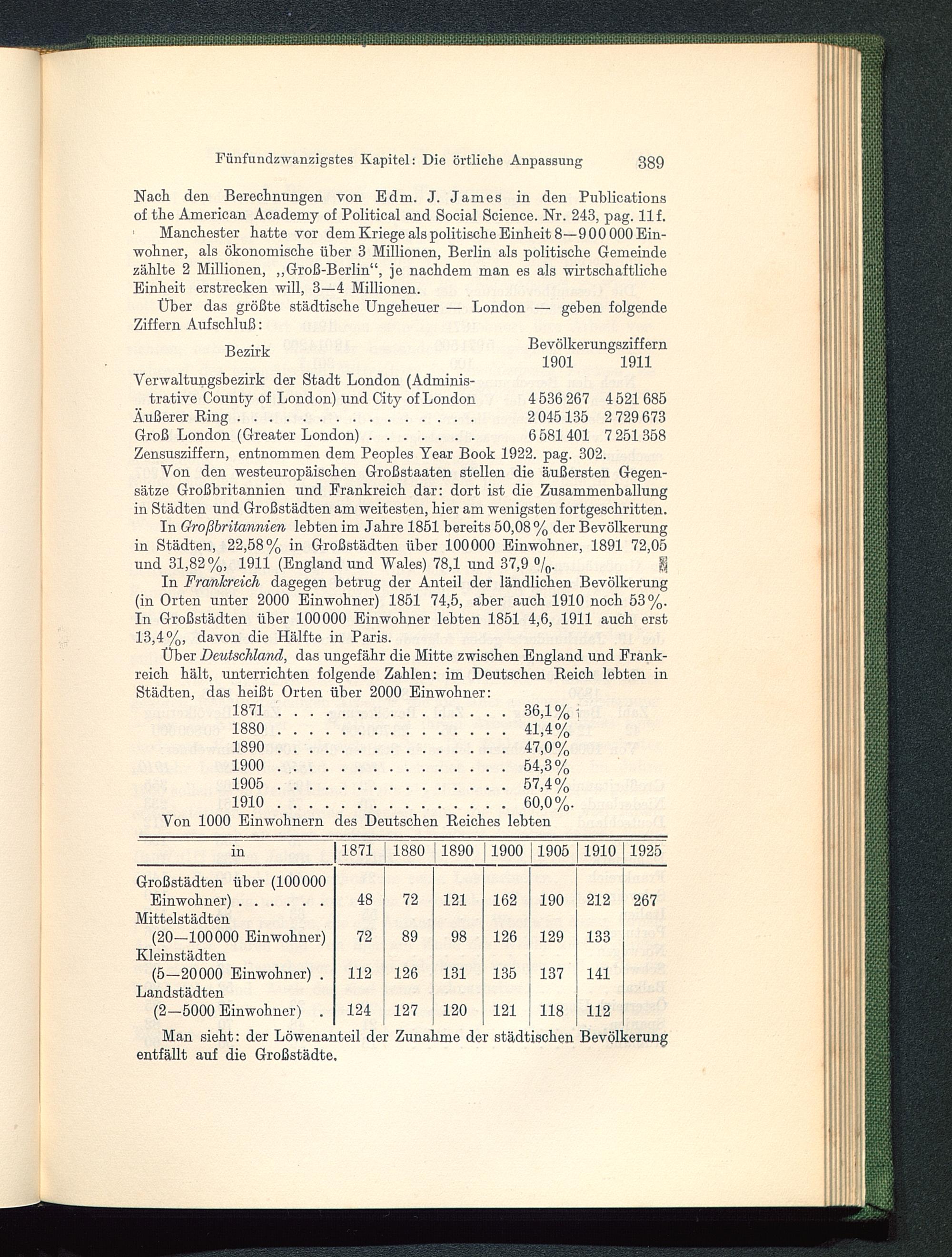 Über Deutschland, das ungefähr die Mitte zwischen England und Frank-reich hält, unterrichten folgende Zahlen: im Deutschen Reich lebten inStädten, das heißt Orten über 2000 Einwohner: