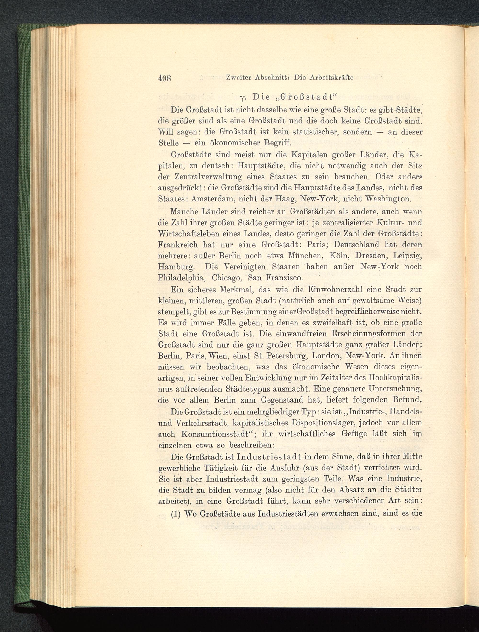 Ein sicheres Merkmal, das wie die Einwohnerzahl eine Stadt zurkleinen, mittleren, großen Stadt (natürlich auch auf gewaltsame Weise)stempelt, gibt es zur Bestimmung einer Großstadt begreiflicherweise nicht.Es wird immer Fälle geben, in denen es zweifelhaft ist, ob eine großeStadt eine Großstadt ist. Die einwandfreien Erscheinungsformen derGroßstadt sind nur die ganz großen Hauptstädte ganz großer Länder:Berlin, Paris, Wien, einst St. Petersburg, London, New-York. An ihnenmüssen wir beobachten, was das ökonomische Wesen dieses eigen-artigen, in seiner vollen Entwicklung nur im Zeitalter des Hochkapitalis-mus auftretenden Städtetypus ausmacht. Eine genauere Untersuchung,die vor allem Berlin zum Gegenstand hat, liefert folgenden Befund.