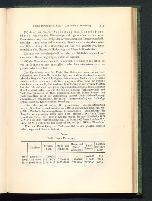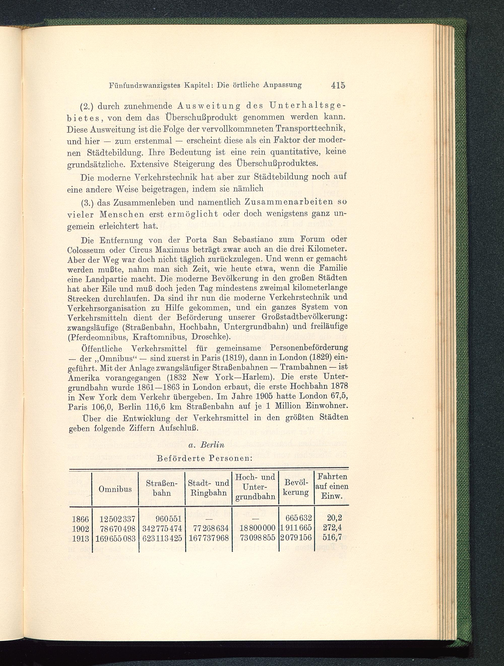 Öffentliche Verkehrsmittel für gemeinsame Personenbeförderung— der „Omnibus“ — sind zuerst in Paris (1819), dann in London (1829) ein-geführt. Mit der Anlage zwangsläufiger Straßenbahnen — Trambahnen — istAmerika vorangegangen (1832 New York—Harlem) . Die erste Unter-grundbahn wurde 1861—1863 in London erbaut, die erste Hochbahn 1878in New York dem Verkehr übergeben. Im Jahre 1905 hatte London 67,5,Paris 106,0, Berlin 116,6 km Straßenbahn auf je 1 Million Einwohner.