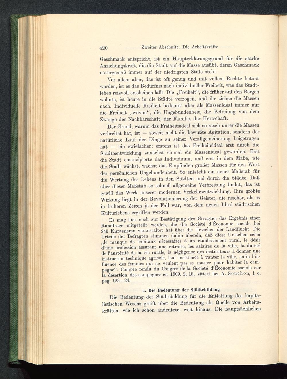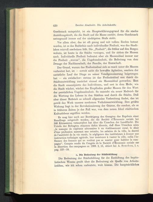 Es mag hier noch zur Bestätigung des Gesagten das Ergebnis einerRundfrage mitgeteilt werden, die die Societe d’Economie sociale bei240 Kürassieren veranstaltet hat über die Ursachen der Landflucht. DieUrteile der Befragten stimmen dahin überein, daß diese Ursachen seien„le manque de capitaux neeessaires ä un etablissement rural, le desird’une profession assurant une retraite, les salaires de la ville, la duretede l’austerite de la vie rurale, la negligence des instituteurs ä donner uneinstruction technique agricole, leur insistence ä vanter la ville, enfin l’in-fluence des femmes qui ne veulent pas se marier pour habiter la Cam-pagne“. Compte rendu du Congres de la Societe d’Economie sociale surla desertion des campagnes en 1909. 2, 15, zitiert bei A. Souclion, 1. c.pag. 123—24.