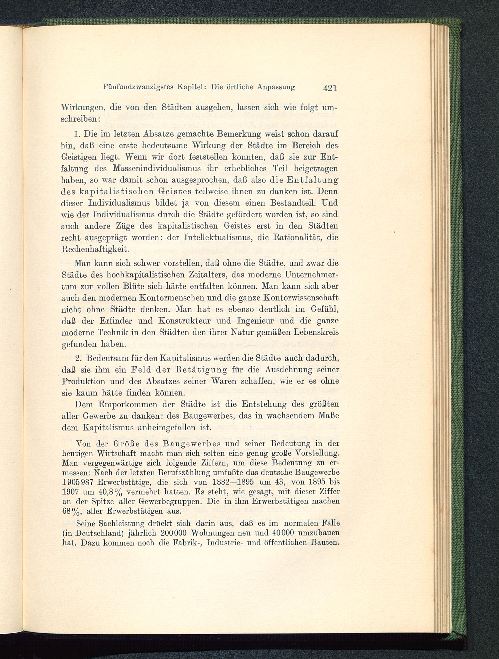 Man kann sich schwer vorstellen, daß ohne die Städte, und zwar dieStädte des hochkapitalistischen Zeitalters, das moderne Unternehmer-tum zur vollen Blüte sich hätte entfalten können. Man kann sich aberauch den modernen Kontormenschen und die ganze Kontorwissenschaftnicht ohne Städte denken. Man hat es ebenso deutlich im Gefühl,daß der Erfinder und Konstrukteur und Ingenieur und die ganzemoderne Technik in den Städten den ihrer Natur gemäßen Lebenskreisgefunden haben.