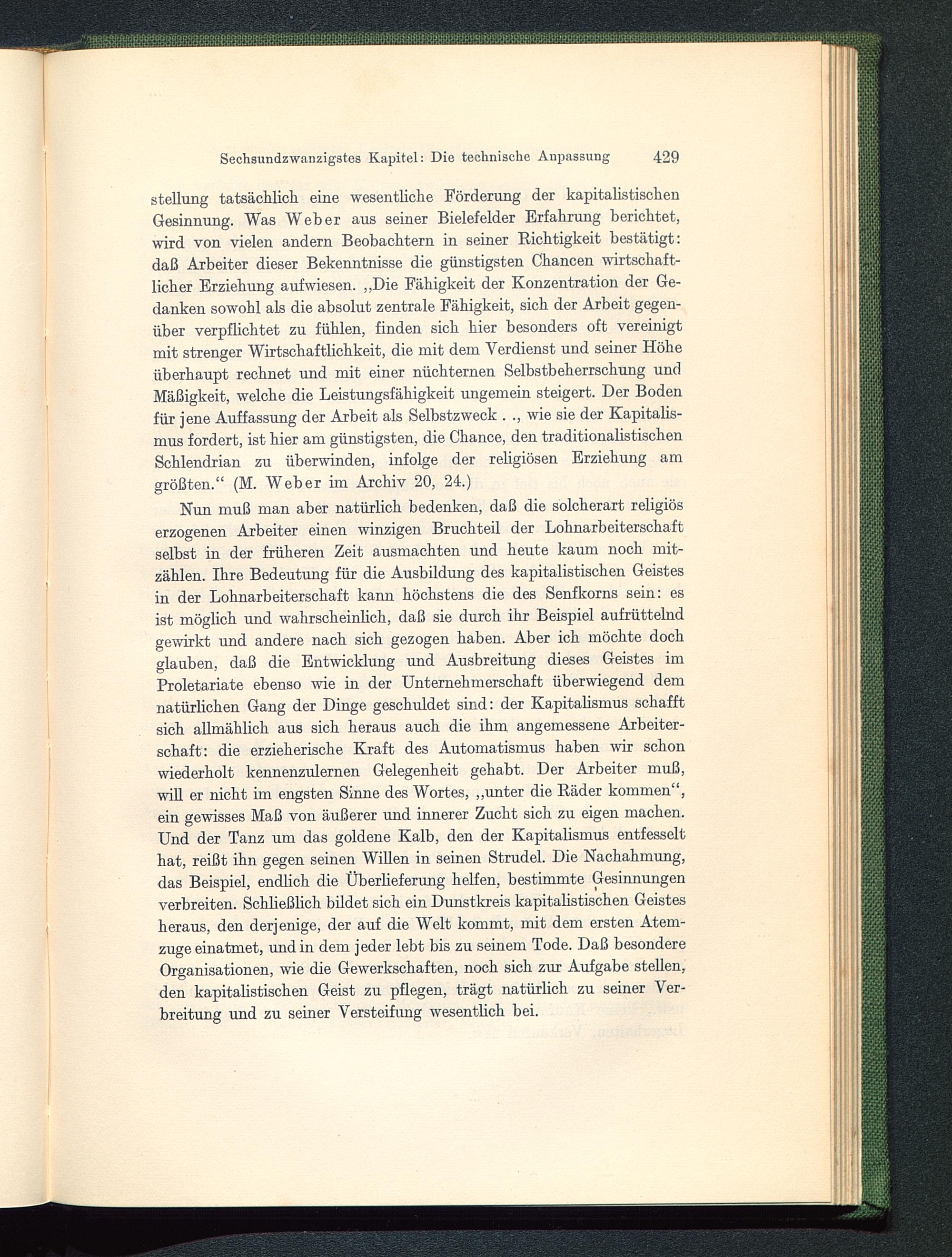 Stellung tatsächlich eine wesentliche Förderung der kapitalistischen Gesinnung. Was Weber aus seiner Bielefelder Erfahrung berichtet,wird von vielen andern Beobachtern in seiner Richtigkeit bestätigt:daß Arbeiter dieser Bekenntnisse die günstigsten Chancen wirtschaft-licher Erziehung aufwiesen. „Die Fähigkeit der Konzentration der Ge-danken sowohl als die absolut zentrale Fähigkeit, sich der Arbeit gegen-über verpflichtet zu fühlen, finden sich hier besonders oft vereinigtmit strenger Wirtschaftlichkeit, die mit dem Verdienst und seiner Höheüberhaupt rechnet und mit einer nüchternen Selbstbeherrschung undMäßigkeit, welche die Leistungsfähigkeit ungemein steigert. Der Bodenfür jene Auffassung der Arbeit als Selbstzweck . ., wie sie der Kapitalis-mus fordert, ist hier am günstigsten, die Chance, den traditionalistischenSchlendrian zu überwinden, infolge der religiösen Erziehung amgrößten.“ (M. Weber im Archiv 20, 24.)