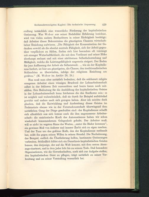 Nun muß man aber natürlich bedenken, daß die solcherart religiöserzogenen Arbeiter einen winzigen Bruchteil der Lohnarbeiterschaftselbst in der früheren Zeit ausmachten und heute kaum noch mit-zählen. Ihre Bedeutung für die Ausbildung des kapitalistischen Geistesin der Lohnarbeiterschaft kann höchstens die des Senfkorns sein: esist möglich und wahrscheinüch, daß sie durch ihr Beispiel aufrüttelndgewirkt und andere nach sich gezogen haben. Aber ich möchte dochglauben, daß die Entwicklung und Ausbreitung dieses Geistes imProletariate ebenso wie in der Unternehmerschaft überwiegend demnatürlichen Gang der Dinge geschuldet sind: der Kapitalismus schafftsich allmählich aus sich heraus auch die ihm angemessene Arbeiter-schaft: die erzieherische Kraft des Automatismus haben wir schonwiederholt kennenzulernen Gelegenheit gehabt. Der Arbeiter muß,will er nicht im engsten Sinne des Wortes, „unter die Räder kommen“,ein gewisses Maß von äußerer und innerer Zucht sich zu eigen machen.Und der Tanz um das goldene Kalb, den der Kapitalismus entfesselthat, reißt ihn gegen seinen Willen in seinen Strudel. Die Nachahmung,das Beispiel, endlich die Überheferung helfen, bestimmte Gesinnungenverbreiten. Schließlich bildet sich ein Dunstkreis kapitalistischen Geistesheraus, den derjenige, der auf die Welt kommt, mit dem ersten Atem-zuge einatmet, und in dem jeder lebt bis zu seinem Tode. Daß besondereOrganisationen, wie die Gewerkschaften, noch sich zur Aufgabe stellen,den kapitalistischen Geist zu pflegen, trägt natürlich zu seiner Ver-breitung und zu seiner Versteifung wesentlich bei.
