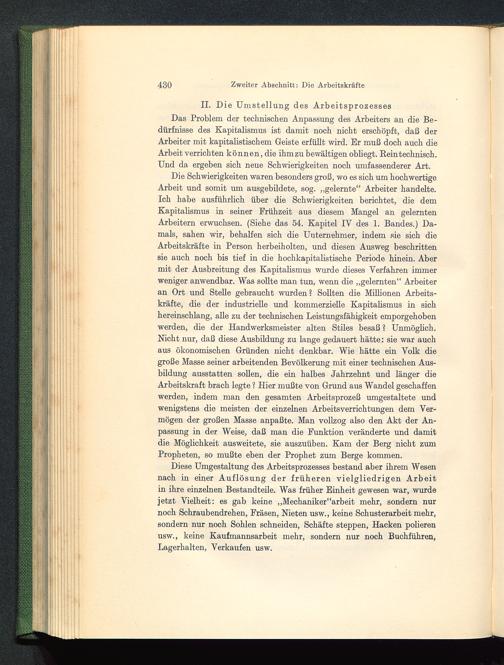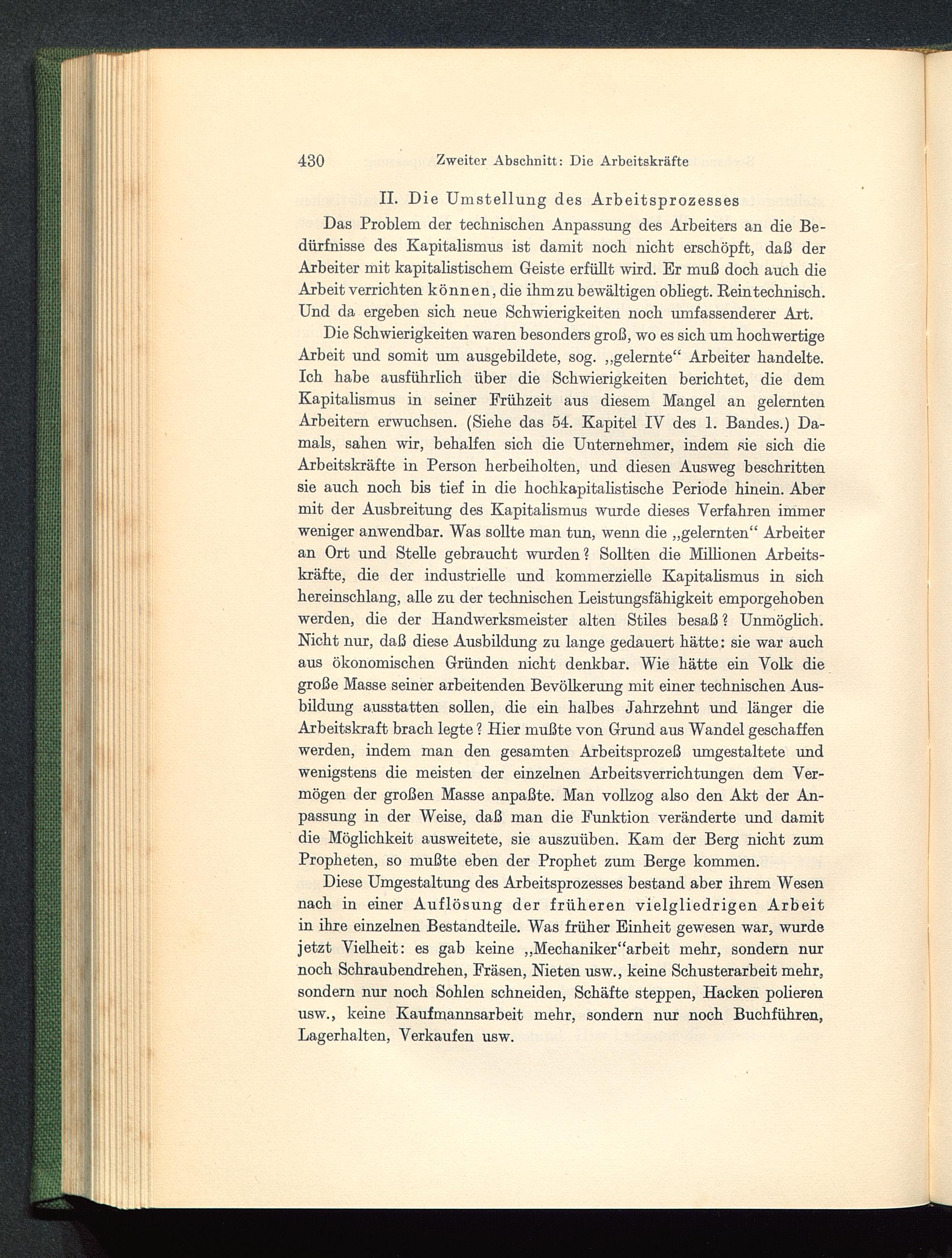 Die Schwierigkeiten waren besonders groß, wo es sich um hochwertigeArbeit und somit um ausgebildete, sog. „gelernte“ Arbeiter handelte.Ich habe ausführlich über die Schwierigkeiten berichtet, die demKapitalismus in seiner Erühzeit aus diesem Mangel an gelerntenArbeitern erwuchsen. (Siehe das 54. Kapitel IV des 1. Bandes.) Da-mals, sahen wir, behalfen sich die Unternehmer, indem sie sich dieArbeitskräfte in Person herbeiholten, und diesen Ausweg beschrittensie auch noch bis tief in die hochkapitalistische Periode hinein. Abermit der Ausbreitung des Kapitalismus wurde dieses Verfahren immerweniger anwendbar. Was sollte man tun, wenn die „gelernten“ Arbeiteran Ort und Stelle gebraucht wurden? Sollten die Millionen Arbeits-kräfte, die der industrielle und kommerzielle Kapitalismus in sichhereinschlang, alle zu der technischen Leistungsfähigkeit emporgehobenwerden, die der Handwerksmeister alten Stiles besaß ? Unmöglich.Nicht nur, daß diese Ausbildung zu lange gedauert hätte: sie war auchaus ökonomischen Gründen nicht denkbar. Wie hätte ein Volk diegroße Masse seiner arbeitenden Bevölkerung mit einer technischen Aus-bildung ausstatten sollen, die ein halbes Jahrzehnt und länger dieArbeitskraft brach legte ? Hier mußte von Grund aus Wandel geschaffenwerden, indem man den gesamten Arbeitsprozeß umgestaltete undwenigstens die meisten der einzelnen Arbeitsverrichtungen dem Ver-mögen der großen Masse anpaßte. Man vollzog also den Akt der An-passung in der Weise, daß man die Funktion veränderte und damitdie Möglichkeit ausweitete, sie auszuüben. Kam der Berg nicht zumPropheten, so mußte eben der Prophet zum Berge kommen.
