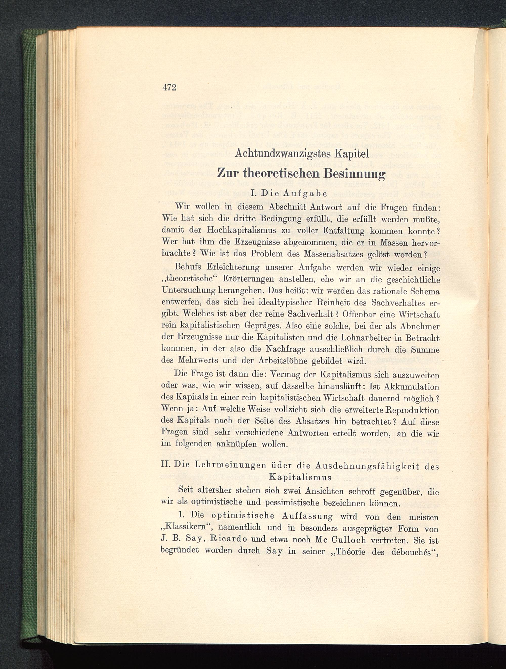 1. Die optimistische Auffassung wird von den meisten„Klassikern“, namentlich und in besonders ausgeprägter Form vonJ. B. Say, Ricardo und etwa noch Mc Culloch vertreten. Sie istbegründet worden durch Say in seiner „Theorie des debouches“,