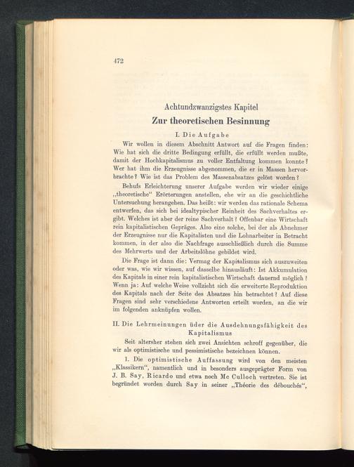 Die Frage ist dann die: Vermag der Kapitalismus sich auszuweitenoder was, wie wir wissen, auf dasselbe hinausläuft: Ist Akkumulationdes Kapitals in einer rein kapitalistischen Wirtschaft dauernd möglich ?Wenn ja: Auf welche Weise vollzieht sich die erweiterte Reproduktiondes Kapitals nach der Seite des Absatzes hin betrachtet? Auf dieseFragen sind sehr verschiedene Antworten erteilt worden, an die wirim folgenden anknüpfen wollen.