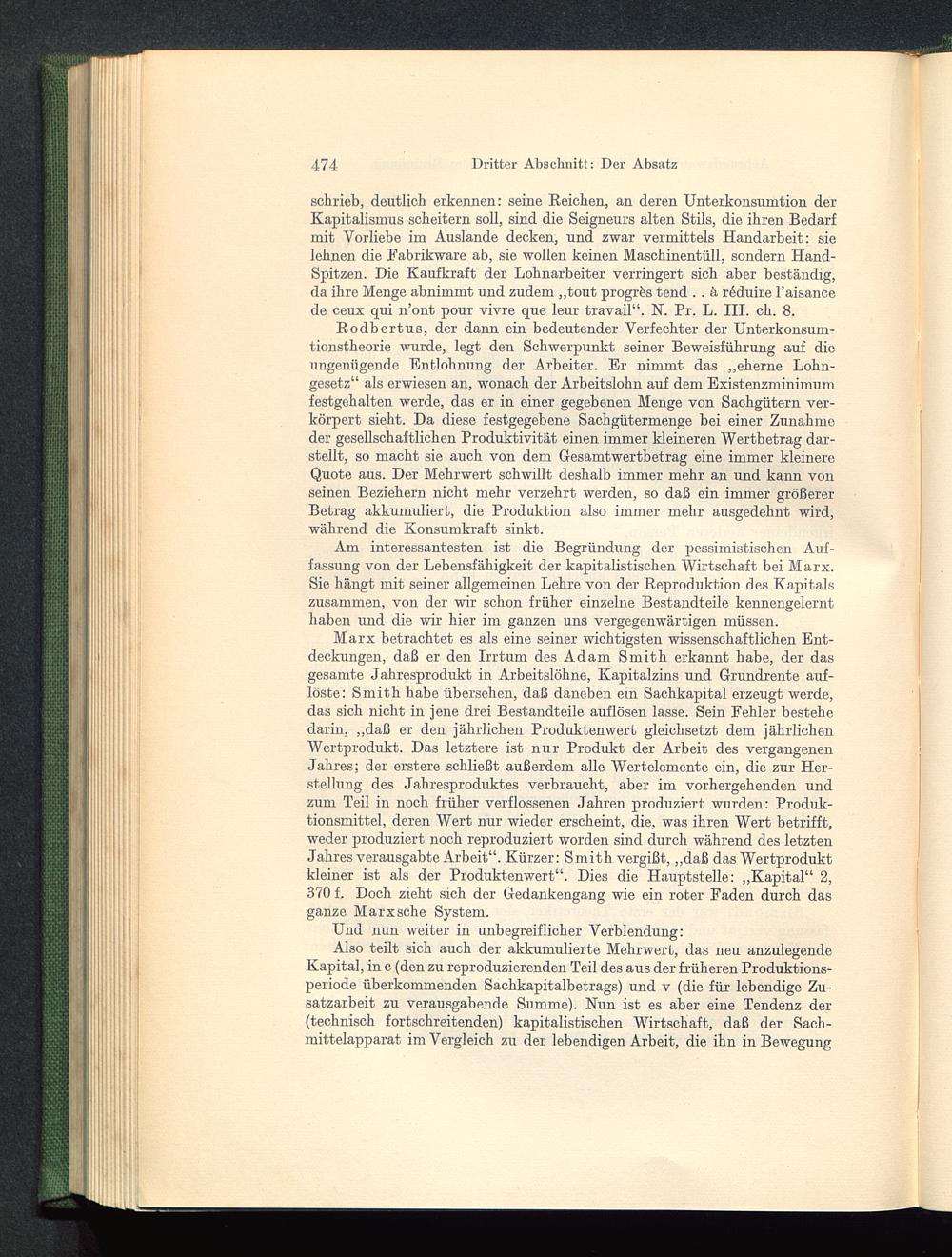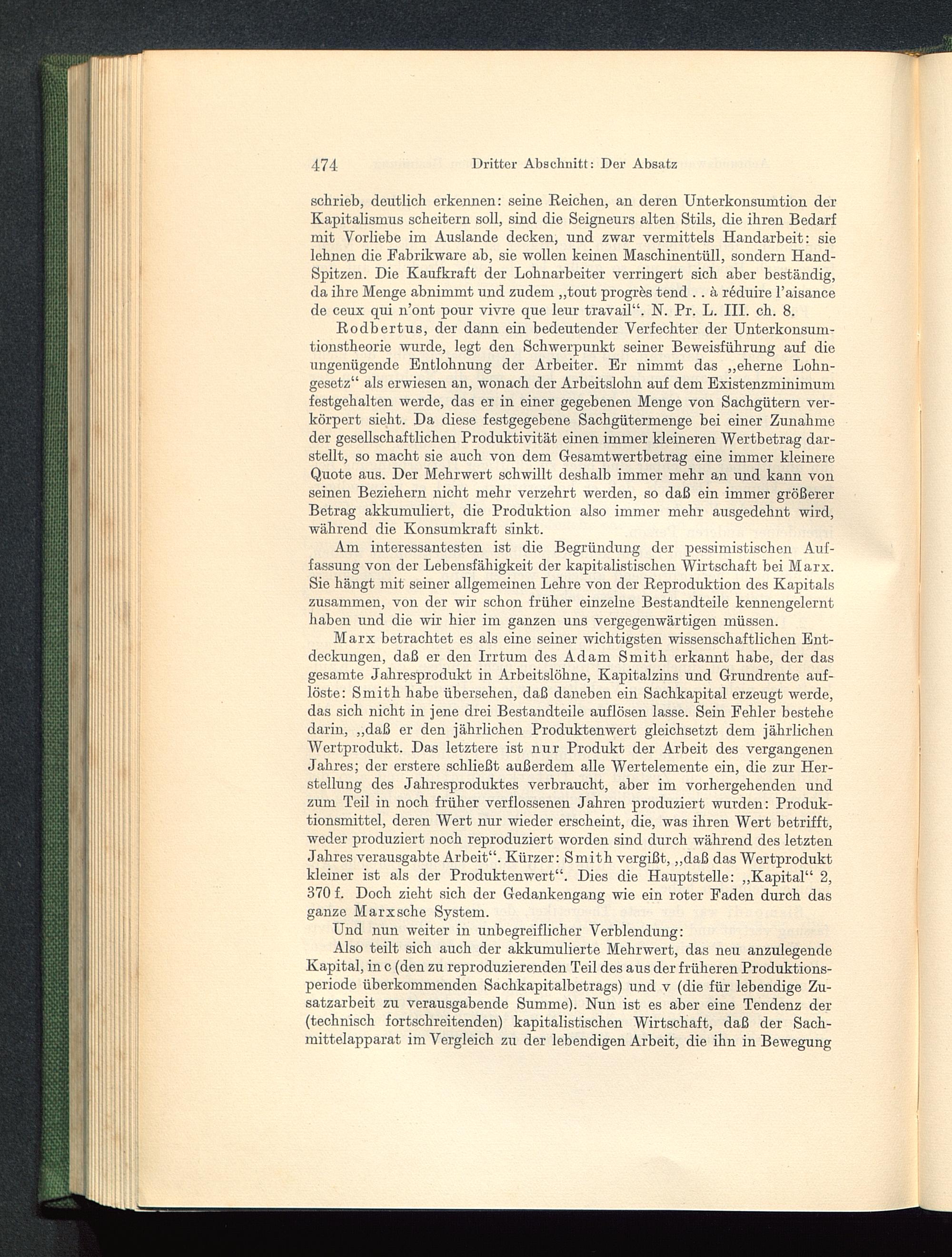 Marx betrachtet es als eine seiner wichtigsten wissenschaftlichen Ent-deckungen, daß er den Irrtum des Adam Smith erkannt habe, der dasgesamte Jahresprodukt in Arbeitslöhne, Kapitalzins und Grundrente auf-löste: Smith habe übersehen, daß daneben ein Sachkapital erzeugt werde,das sich nicht in jene drei Bestandteile auflösen lasse. Sein Fehler bestehedarin, „daß er den jährlichen Produktenwert gleichsetzt dem jährlichenWertprodukt. Das letztere ist nur Produkt der Arbeit des vergangenenJahres; der erstere schließt außerdem alle Wertelemente ein, die zur Her-stellung des Jahresproduktes verbraucht, aber im vorhergehenden undzum Teil in noch früher verflossenen Jahren produziert wurden: Produk-tionsmittel, deren Wert nur wieder erscheint, die, was ihren Wert betrifft,weder produziert noch reproduziert worden sind durch während des letztenJahres verausgabte Arbeit“. Kürzer: Smith vergißt, „daß das Wertproduktkleiner ist als der Produktenwert“. Dies die Hauptstelle: „Kapital“ 2,370 f. Doch zieht sich der Gedankengang wie ein roter Faden durch dasganze Marxsche System.