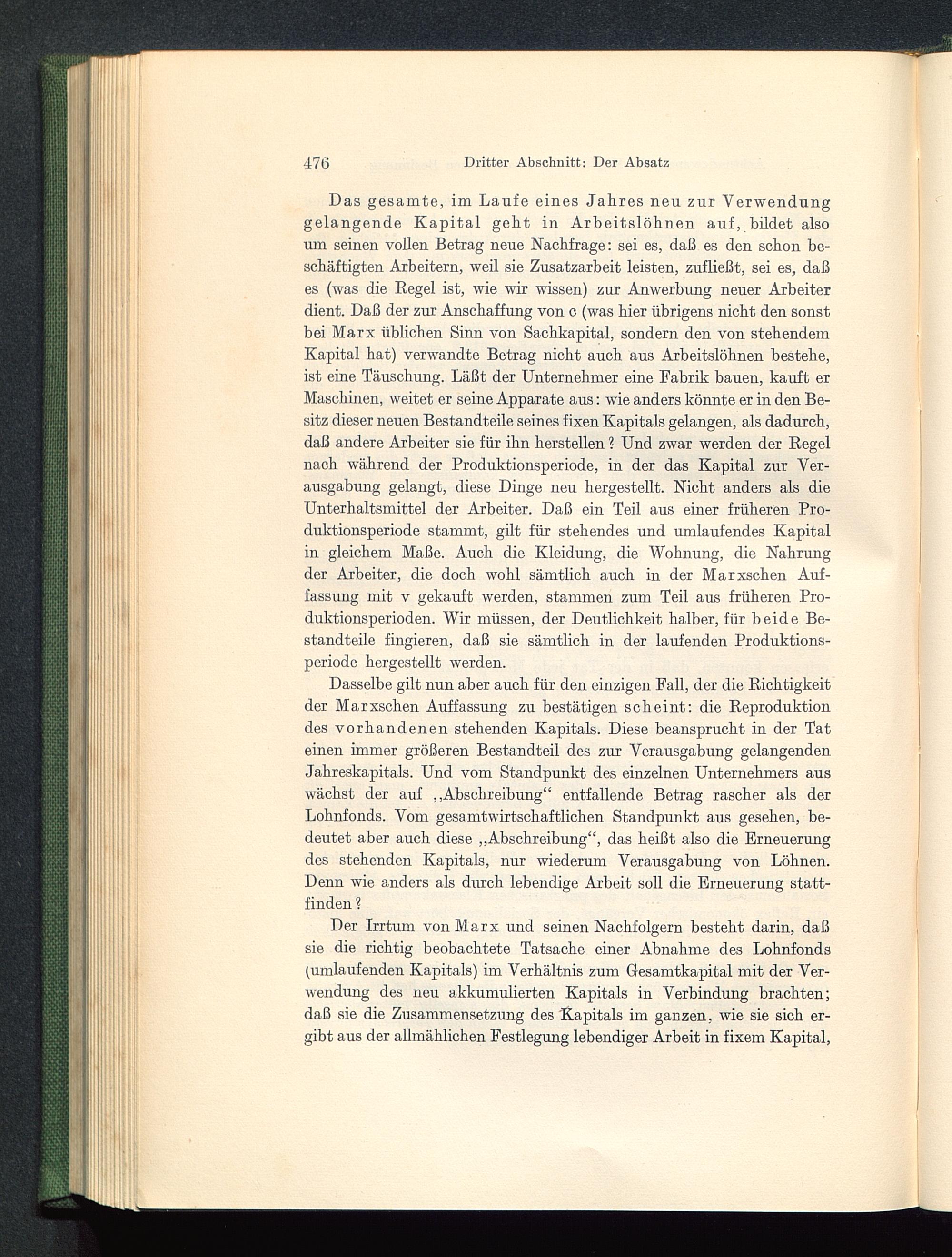 Der Irrtum von Marx und seinen Nachfolgern besteht darin, daßsie die richtig beobachtete Tatsache einer Abnahme des Lohnfonds(umlaufenden Kapitals) im Verhältnis zum Gesamtkapital mit der Ver-wendung des neu akkumulierten Kapitals in Verbindung brachten;daß sie die Zusammensetzung des Kapitals im ganzen, wie sie sich er-gibt aus der allmählichen Festlegung lebendiger Arbeit in fixem Kapital,