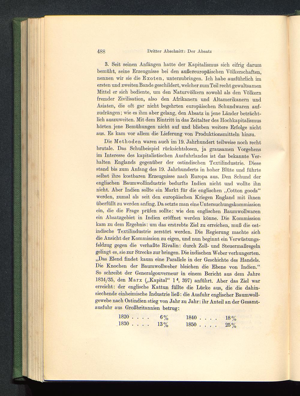 3. Seit seinen Anfängen hatte der Kapitalismus sich eifrig darumbemüht, seine Erzeugnisse bei den außereuropäischen Völkerschaften,nennen wir sie die Exoten, unterzubringen. Ich habe ausführlich imersten und zweiten Bande geschildert, welcher zum Teil recht gewaltsamenMittel er sich bediente, um den Naturvölkern sowohl als den Völkernfremder Zivilisation, also den Afrikanern und Altamerikanern undAsiaten, die oft gar nicht begehrten europäischen Schundwaren auf-zudrängen; wie es ihm aber gelang, den Absatz in jene Länder beträcht-lich auszuweiten. Mit dem Eintritt in das Zeitalter des Hochkapitalismushörten jene Bemühungen nicht auf und blieben weitere Erfolge nichtaus. Es kam vor allem die Lieferung von Produktionsmitteln hinzu.