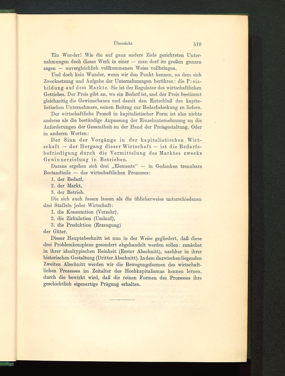 Dieser Hauptabschnitt ist nun in der Weise gegliedert, daß diesedrei Problemkomplexe gesondert abgehandelt werden sollen: zunächstin ihrer idealtypischen Reinheit (Erster Abschnitt), nachher in ihrerhistorischen Gestaltung (Dritter Abschnitt). Indem dazwischenliegendenZweiten Abschnitt weiden wir die Bewegungsformen des wirtschaft-lichen Prozesses im Zeitalter des Hochkapitalismus kennen lernen,durch die bewirkt wird, daß die reinen Formen des Prozesses ihregeschichtlich eigenartige Prägung erhalten.