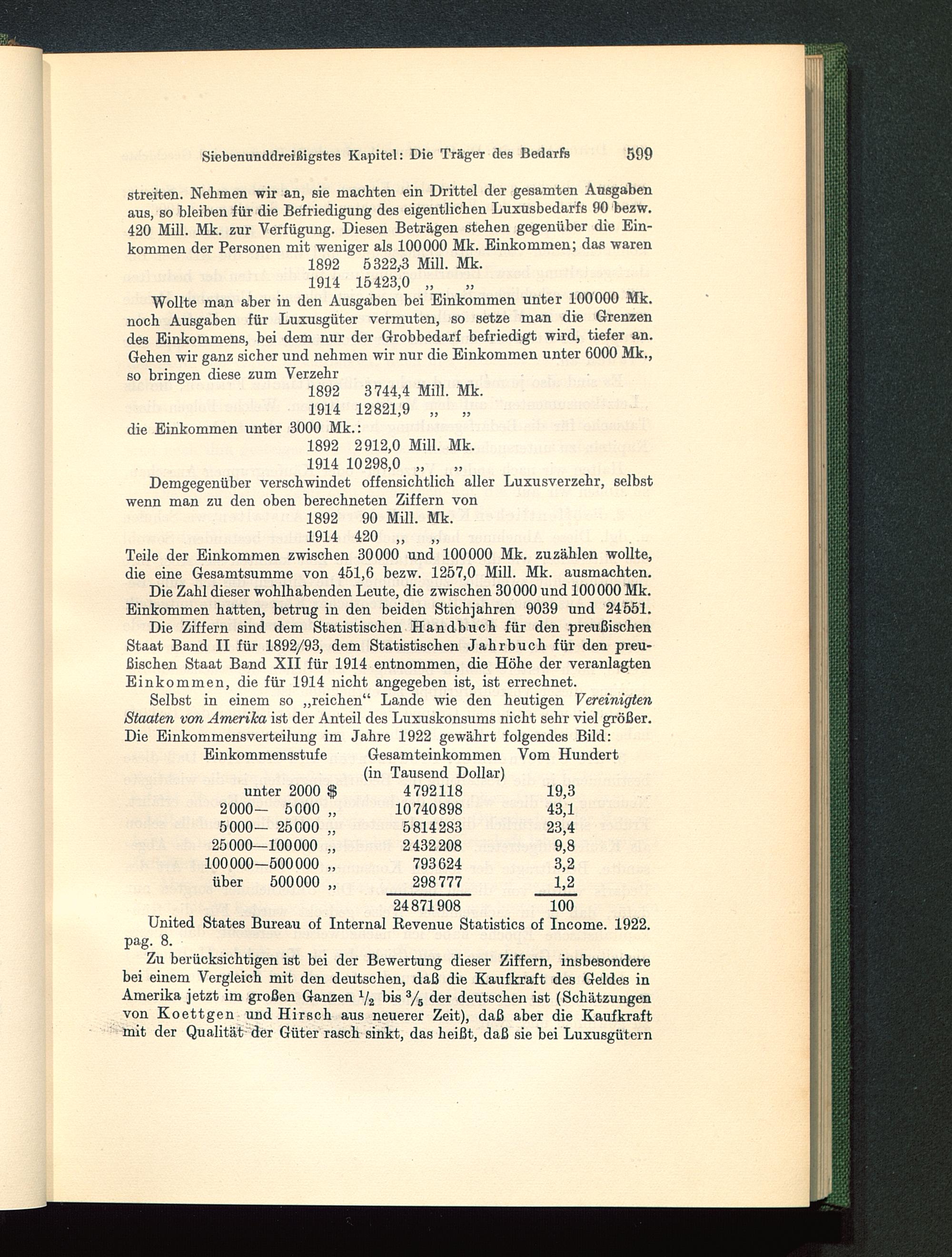 Selbst in einem so „reichen“ Lande wie den heutigen VereinigtenStaaten von Amerika ist der Anteil des Luxuskonsums nicht sehr viel größer.Die Einkommensverteilung im Jahre 1922 gewährt folgendes Bild:Einkommensstufe Gesamteinkommen Vom Hundert