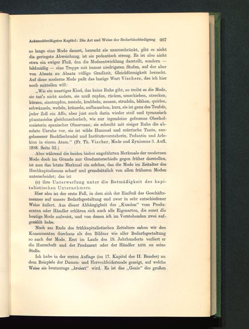 Hier also ist der erste Fall, in dem sich der Einfluß des Geschäfts-mannes auf unsere Bedarfsgestaltung und zwar in sehr entschiedenerWeise äußert. Aus dieser Abhängigkeit des „Kunden“ vom Produ-zenten oder Händler erklären sich auch alle Eigenarten, die sonst dieheutige Mode auf weist, und von denen ich im Vorstehenden zwei auf-gezählt habe.
