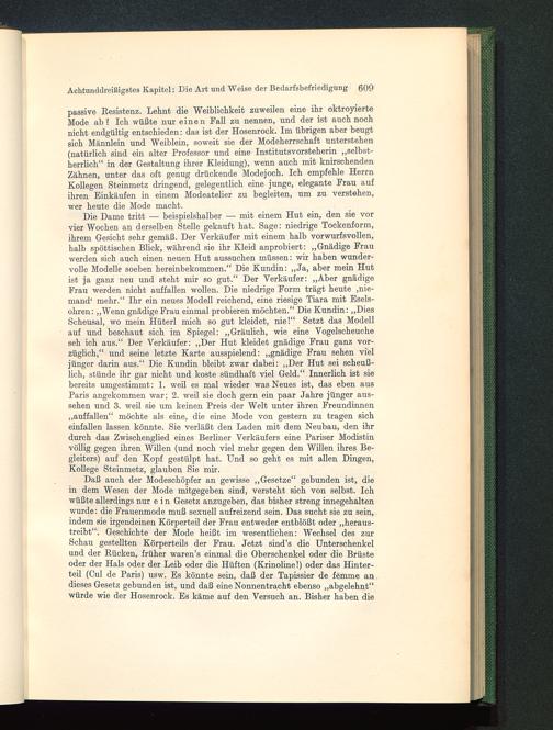 passive Resistenz. Lehnt die Weiblichkeit zuweilen eine ihr oktroyierteMode ab? Ich wüßte nur einen Fall zu nennen, und der ist auch nochnicht endgültig entschieden: das ist der Hosenrock. Im übrigen aber beugtsich Männlein und Weiblein, soweit sie der Modeherrschaft unterstehen(natürlich sind ein alter Professor und eine Institutsvorsteherin „selbst-herrlich“ in der Gestaltung ihrer Kleidung), wenn auch mit knirschendenZähnen, unter das oft genug drückende Modejoch. Ich empfehle HerrnKollegen Steinmetz dringend, gelegentlich eine junge, elegante Frau aufihren Einkäufen in einem Modeatelier zu begleiten, um zu verstehen,wer heute die Mode macht.