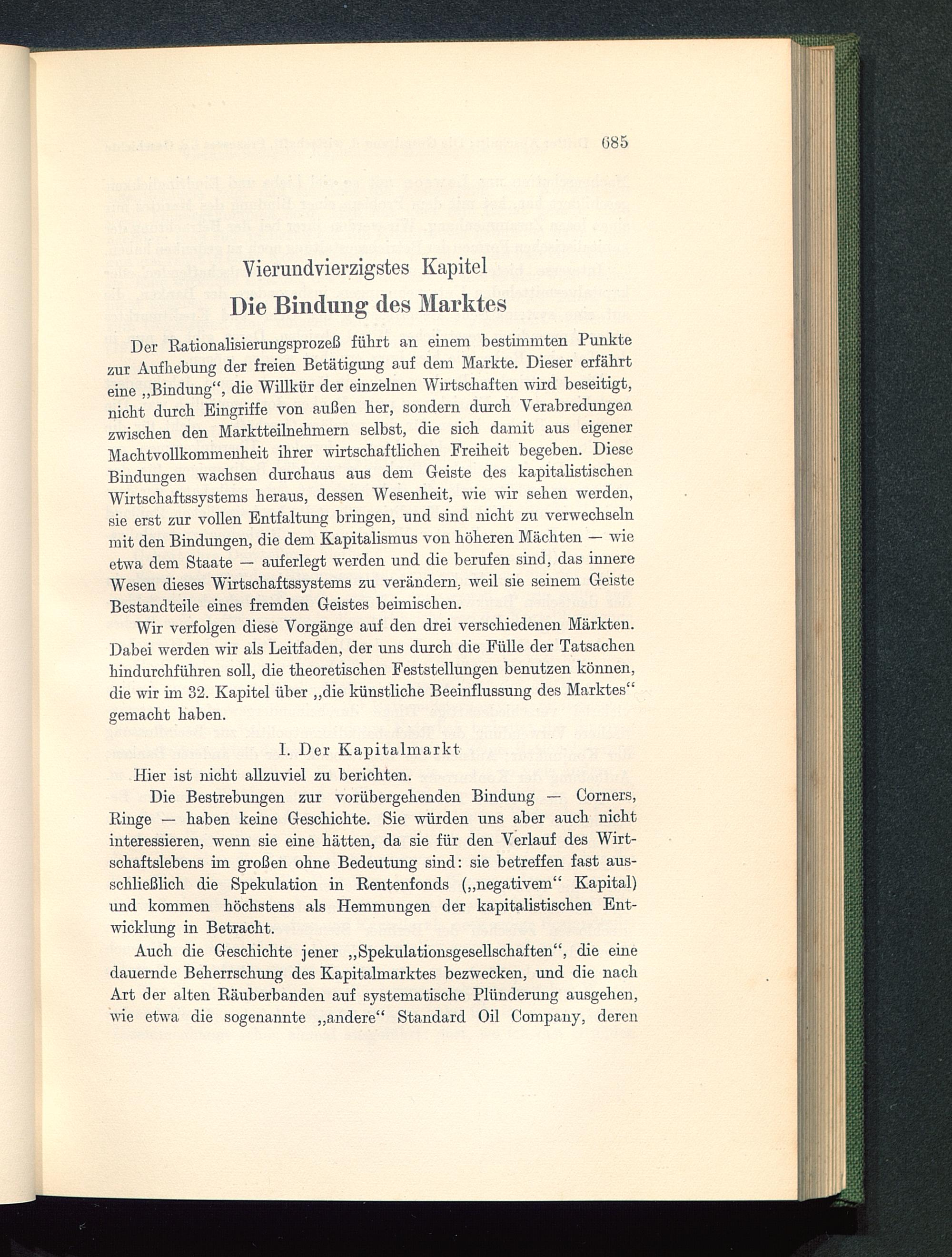 Der Rationalisierungsprozeß führt an einem bestimmten Punktezur Aufhebung der freien Betätigung auf dem Markte. Dieser erfährtpi n e Bindung“, die Willkür der einzelnen Wirtschaften wird beseitigt,nicht durch Eingriffe von außen her, sondern durch Verabredungenzwischen den Marktteilnehmern selbst, die sich damit aus eigenerMachtvollkommenheit ihrer wirtschaftlichen Freiheit begeben. DieseBindungen wachsen durchaus aus dem Geiste des kapitalistischen Wirtschaftssystems heraus, dessen Wesenheit, wie wir sehen werden,sie erst zur vollen Entfaltung bringen, und sind nicht zu verwechselnmit den Bindungen, die dem Kapitalismus von höheren Mächten — wieetwa dem Staate — auf erlegt werden und die berufen sind, das innereWesen dieses Wirtschaftssystems zu verändern, weil sie seinem GeisteBestandteile eines fremden Geistes beimischen.