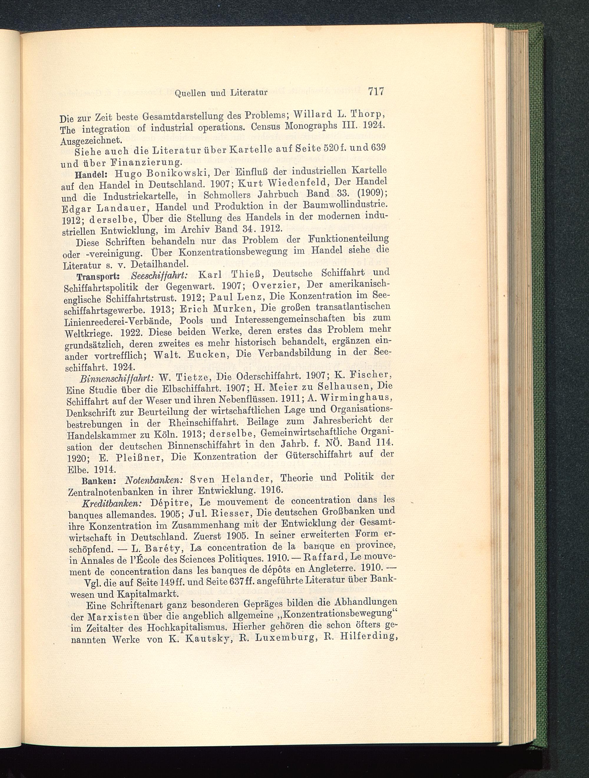 Handel: Hugo Bonikowski, Der Einfluß der industriellen Kartelleauf den Handel in Deutschland. 1907; Kurt Wiedenfeld , Der Handelimd die Industriekartelle, in Schmollers Jahrbuch Band 33. (1909);Edgar Landauer, Handel und Produktion in der Baumwollindustrie.1912; derselbe, Uber die Stellung des Handels in der modernen indu-striellen Entwicklung, im Archiv Band 34. 1912.