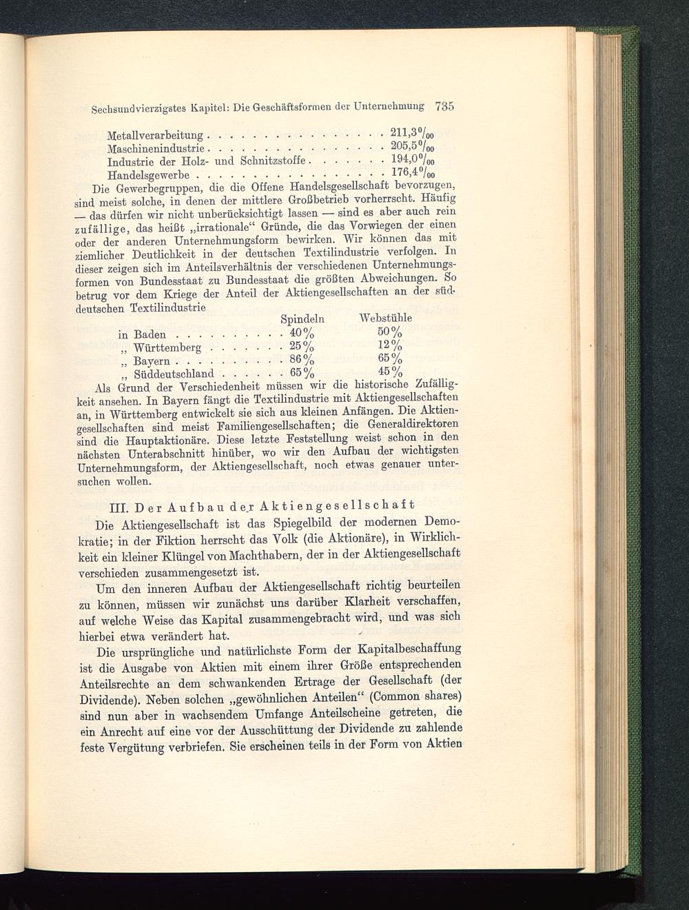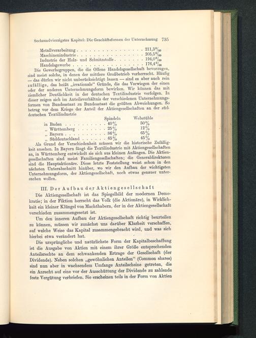 Als Grund der Verschiedenheit müssen wir die historische Zufällig-keit ansehen. In Bayern fängt die Textilindustrie mit Aktiengesellschaftenan, in Württemberg entwickelt sie sich aus kleinen Anfängen. Die Aktien-gesellschaften sind meist Familiengesellschaften; die Generaldirektorensind die Hauptaktionäre. Diese letzte Feststellung weist schon in dennächsten Unterabschnitt hinüber, wo wir den Aufbau der wichtigstenUnternehmungsform, der Aktiengesellschaft, noch etwas genauer unter-suchen wollen.
