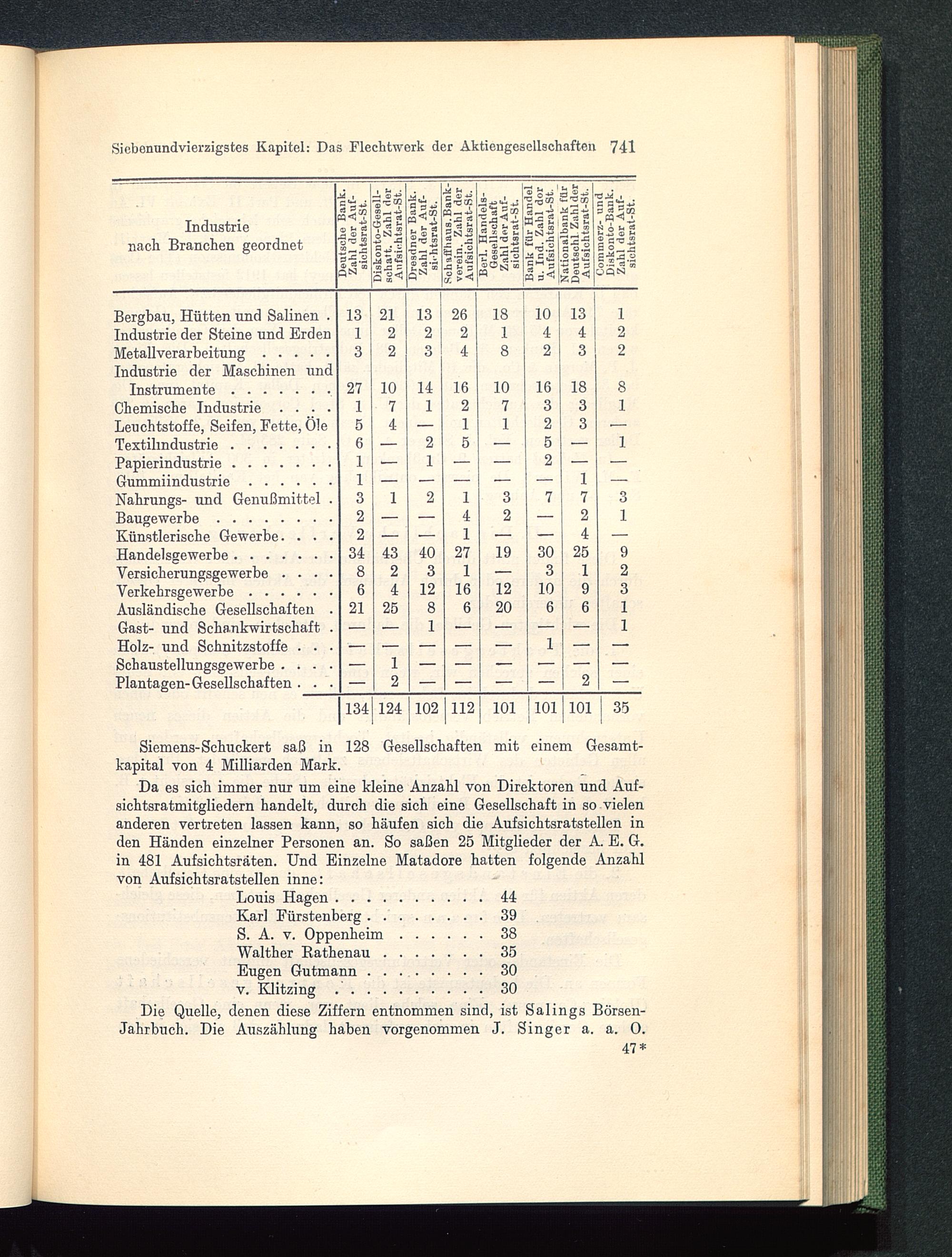 Da es sich immer nur um eine kleine Anzahl von Direktoren und Auf-sichtsratmitgliedern handelt, durch die sich eine Gesellschaft in so vielenanderen vertreten lassen kann, so häufen sich die Aufsichtsratstellen inden Händen einzelner Personen an. So saßen 25 Mitglieder der A. E. G.in 481 Aufsichtsräten. Und Einzelne Matadore hatten folgende Anzahl