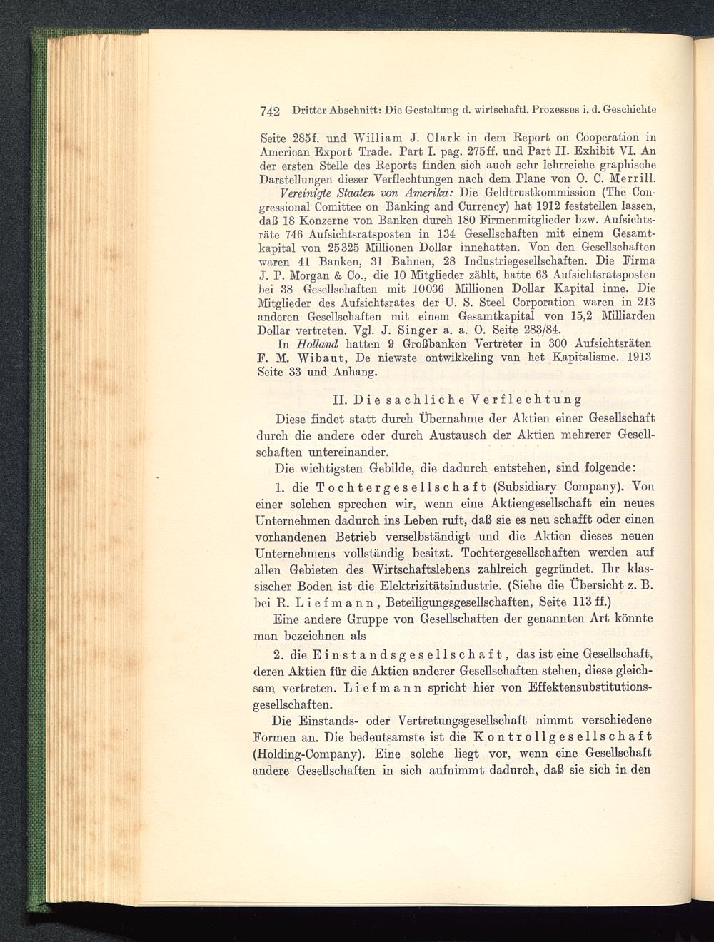Seite 285f. und William J. Clark in dem Report on Cooperation inAmerican Export Trade. Part I. pag. 275 ff. und Part II. Exhibit VI. Ander ersten Stelle des Reports finden sich auch sehr lehrreiche graphischeDarstellungen dieser Verflechtungen nach dem Plane von 0. C. Merrill.