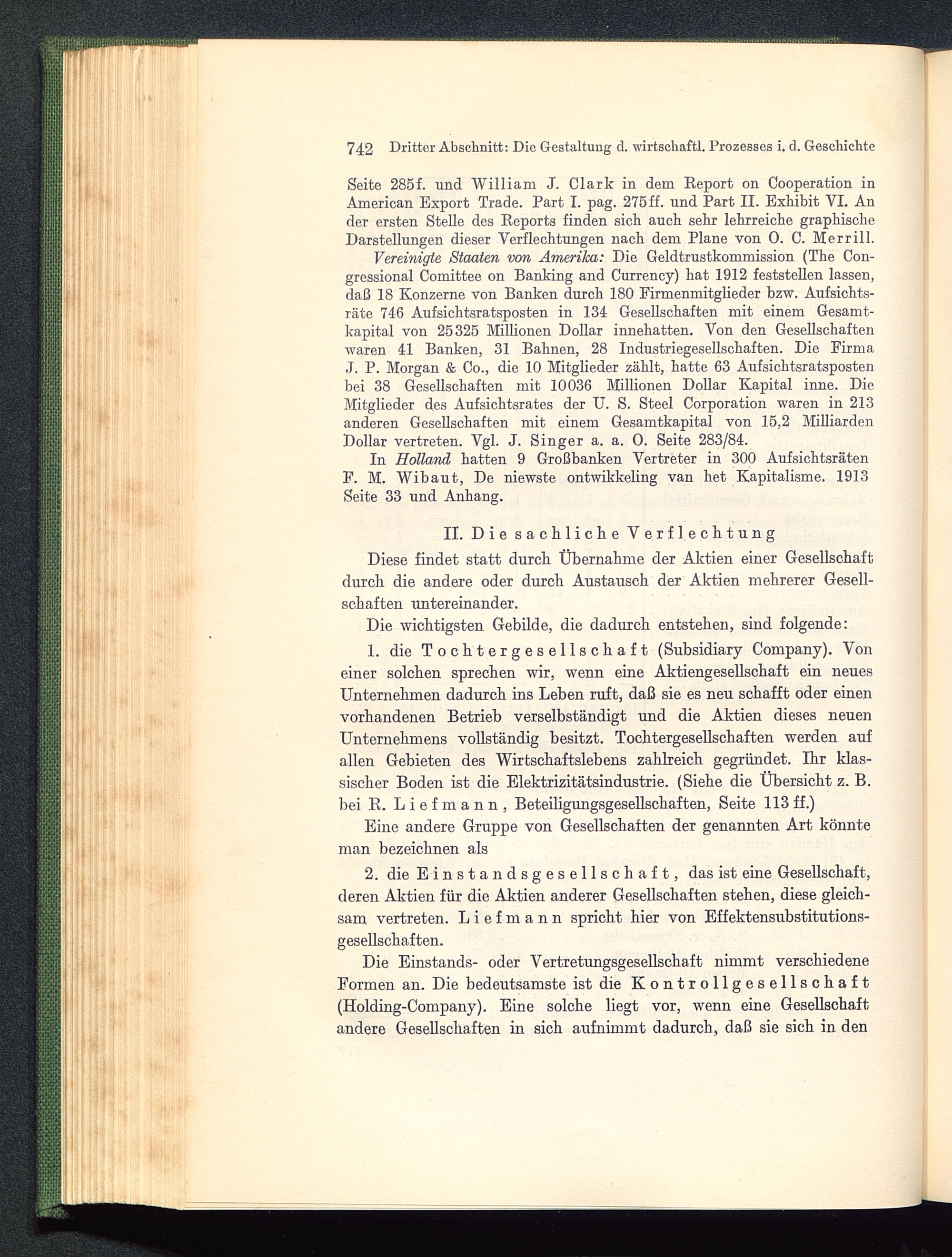 Vereinigte Staaten von Amerika : Die Geldtrustkommission (The Con-gressional Comittee on Banking and Currency) hat 1912 feststellen lassen,daß 18 Konzerne von Banken durch 180 Firmenmitglieder bzw. Aufsichts-räte 746 Aufsichtsratsposten in 134 Gesellschaften mit einem Gesamt-kapital von 25325 Millionen Dollar innehatten. Von den Gesellschaftenwaren 41 Banken, 31 Bahnen, 28 Industriegesellschaften. Die FirmaJ. P. Morgan & Co., die 10 Mitglieder zählt, hatte 63 Aufsichtsratspostenbei 38 Gesellschaften mit 10036 Millionen Dollar Kapital inne. DieMitglieder des Aufsichtsrates der U. S. Steel Corporation waren in 213anderen Gesellschaften mit einem Gesamtkapital von 15,2 MilliardenDollar vertreten. Vgl. J. Singer a. a. 0. Seite 283/84.