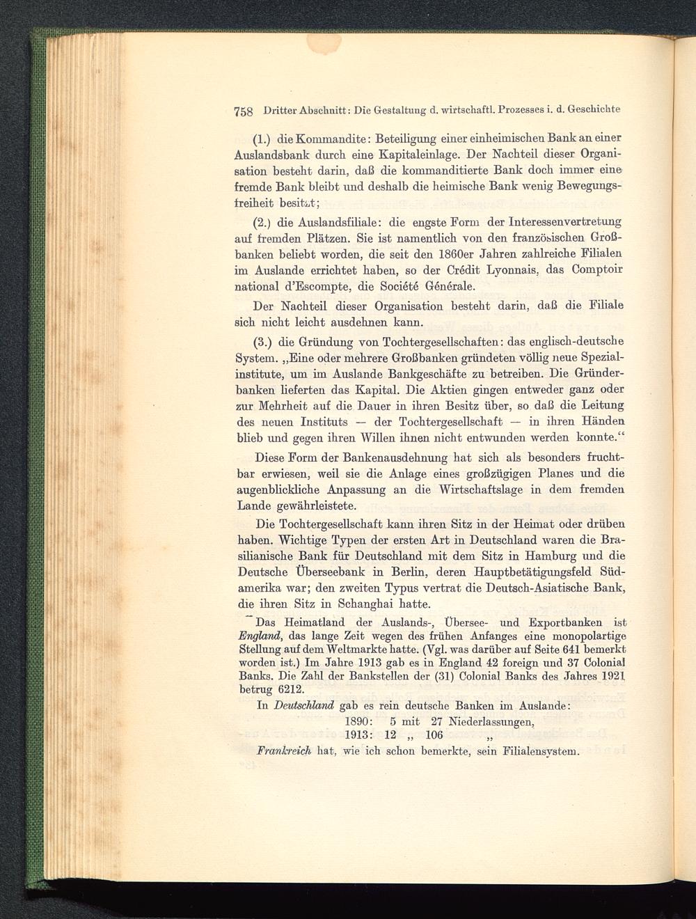 (2.) die Auslandsfiliale: die engste Form der Interessenvertretungauf fremden Plätzen. Sie ist namentlich von den französischen Groß-banken beliebt worden, die seit den 1860er Jahren zahlreiche Filialenim Auslande errichtet haben, so der Credit Lyonnais, das Comptoirnational d’Escompte, die Societe Generale.