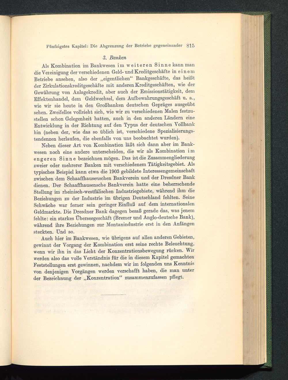 Neben dieser Art von Kombination läßt sich dann aber im Bank-wesen noch eine andere unterscheiden, die wir als Kombination imengeren Sinne bezeichnen mögen. Das ist die Zusammengliederungzweier oder mehrerer Banken mit verschiedenem Tätigkeitsgebiet. Alstypisches Beispiel kann etwa die 1903 gebildete Interessengemeinschaftzwischen dem Schaaffhauseuschen Bankverein und der Dresdner Bankdienen. Der Schaaffhausensche Bankverein hatte eine beherrschendeStellung im rheinisch-westfälischen Industriegebiete, während ihm dieBeziehungen zu der Industrie im übrigen Deutschland fehlten. SeineSchwäche war ferner sein geringer Einfluß auf dem internationalenGeldmärkte. Die Dresdner Bank dagegen besaß gerade das, was jenemfehlte: ein starkes Überseegeschäft (Bremer und Anglo-deutsche Bank),während ihre Beziehungen zur Montanindustrie erst in den Anfängensteckten. Und so.