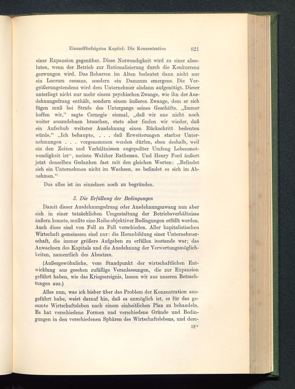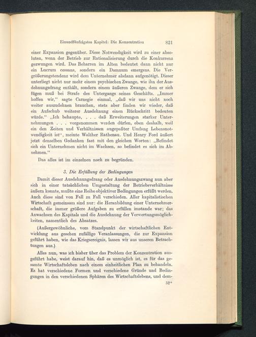 einer Expansion gegenüber. Diese Notwendigkeit wird zu einer abso-luten, wenn der Betrieb zur Rationalisierung durch die Konkurrenzgezwungen wird. Das Beharren im Alten bedeutet dann nicht nurein Lucrum cessans, sondern ein Damnum emergens. Die Ver-größerungstendenz wird dem Unternehmer alsdann aufgenötigt. Dieserunterliegt nicht nur mehr einem psychischen Zwange, wie ihn der Aus-dehnungsdrang enthält, sondern einem äußeren Zwange, dem er sichfügen muß bei Strafe des Untergangs seines Geschäfts. „Immerhoffen wir,“ sagte Carnegie einmal, „daß wir uns nicht nochweiter auszudehnen brauchen, stets aber finden wir wieder, daßein Aufschub weiterer Ausdehnung einen Rückschritt bedeutenwürde.“ „Ich behaupte, . . . daß Erweiterungen starker Unter-nehmungen . . . vorgenommen weiden dürfen, eben deshalb, weilein den Zeiten und Verhältnissen angepaßter Umfang Lebensnot-wendigkeit ist“, meinte Walther Rathenau. Und Henry Ford äußertjetzt denselben Gedanken fast mit den gleichen Worten: „Befindetsich ein Unternehmen nicht im Wachsen, so befindet es sich im Ab-nehmen.“