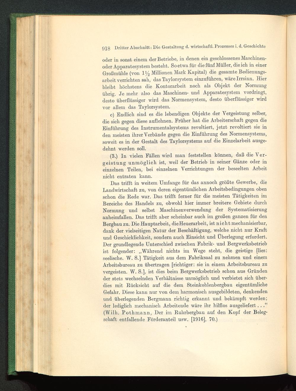 Das trifft in weitem Umfange für das annoch größte Gewerbe, dieLandwirtschaft zu, von deren eigentümlichen Arbeitsbedingungen obenschon die Rede war. Das trifft ferner für die meisten Tätigkeiten imBereiche des Handels zu, obwohl hier immer breitere Gebiete durchNormung und selbst Maschinenverwendung der Systematisierunganheimfallen. Das trifft aber scheinbar auch im großen ganzen für denBergbau zu. Die Hauptarbeit, dieHeuerarbeit, ist nicht mechanisierbar,dank der vielseitigen Natur der Beschäftigung, welche nicht nur Kraftund Geschicklichkeit, sondern auch Einsicht und Überlegung erfordert.Der grundlegende Unterschied zwischen Fabrik- und Bergwerksbetriebist folgender: „Während nichts im Wege steht, die geistige [lies:seelische. W. S.] Tätigkeit aus dem Fabriksaal zu nehmen und einemArbeitsbureau zu übertragen [richtiger: sie in einem Arbeitsbureau zuvergeisten. W. S.], ist dies beim Bergwerksbetrieb schon aus Gründender stets wechselnden Verhältnisse unmöglich und verbietet sich über-dies mit Rücksicht auf die dem Steinkohlenbergbau eigentümlicheGefahr. Diese kann nur von dein harmonisch ausgebildeten, denkendenund überlegenden Bergmann richtig erkannt und bekämpft werden;der lediglich mechanisch Arbeitende wäre ihr hilflos ausgeliefert. . .“(Wilh. Pothmann, Der im Ruhrbergbau auf den Kopf der Beleg-schaft entfallende Förderanteil usw. [1916], 70.)