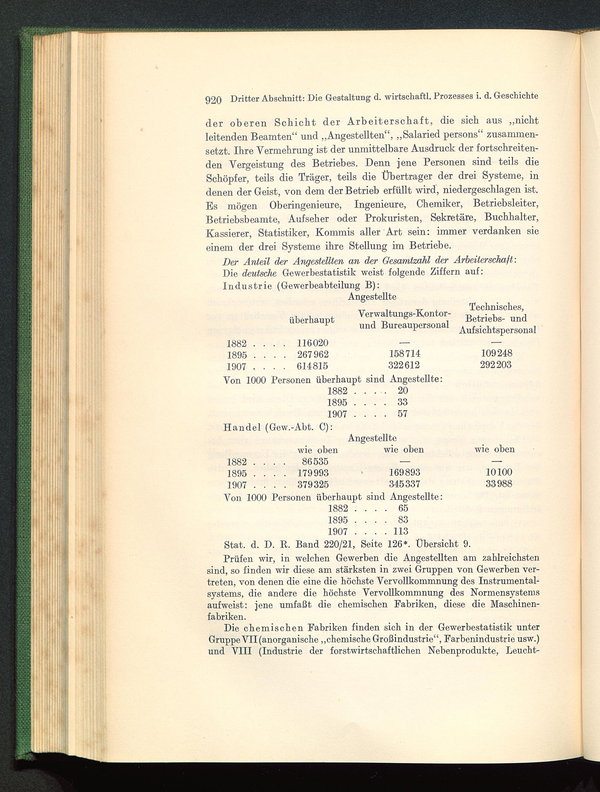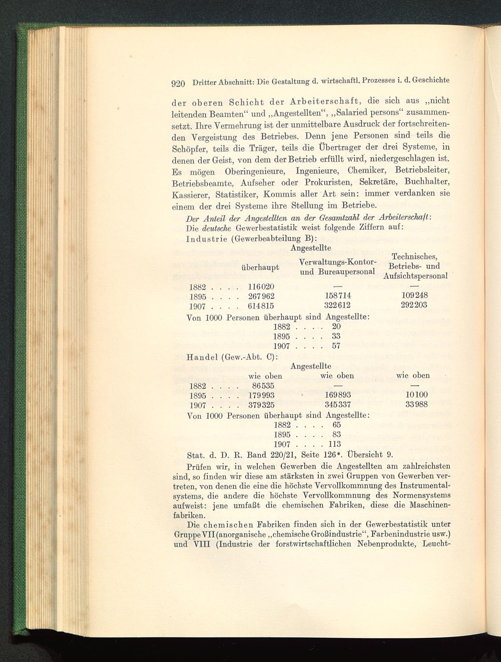 der oberen Schicht der Arbeiterschaft, die sich aus „nichtleitenden Beamten“ und „Angestellten “, „Salaried persons“ zusammen-setzt. Ihre Vermehrung ist der unmittelbare Ausdruck der fortschreiten-den Vergeistung des Betriebes. Denn jene Personen sind teils dieSchöpfer, teils die Träger, teils die Übertrager der drei Systeme, indenen der Geist, von dem der Betrieb erfüllt wird, niedergeschlagen ist.Es mögen Oberingenieure, Ingenieure, Chemiker, Betriebsleiter,Betriebsbeamte, Aufseher oder Prokuristen, Sekretäre, Buchhalter,Kassierer, Statistiker, Kommis aller Art sein: immer verdanken sie