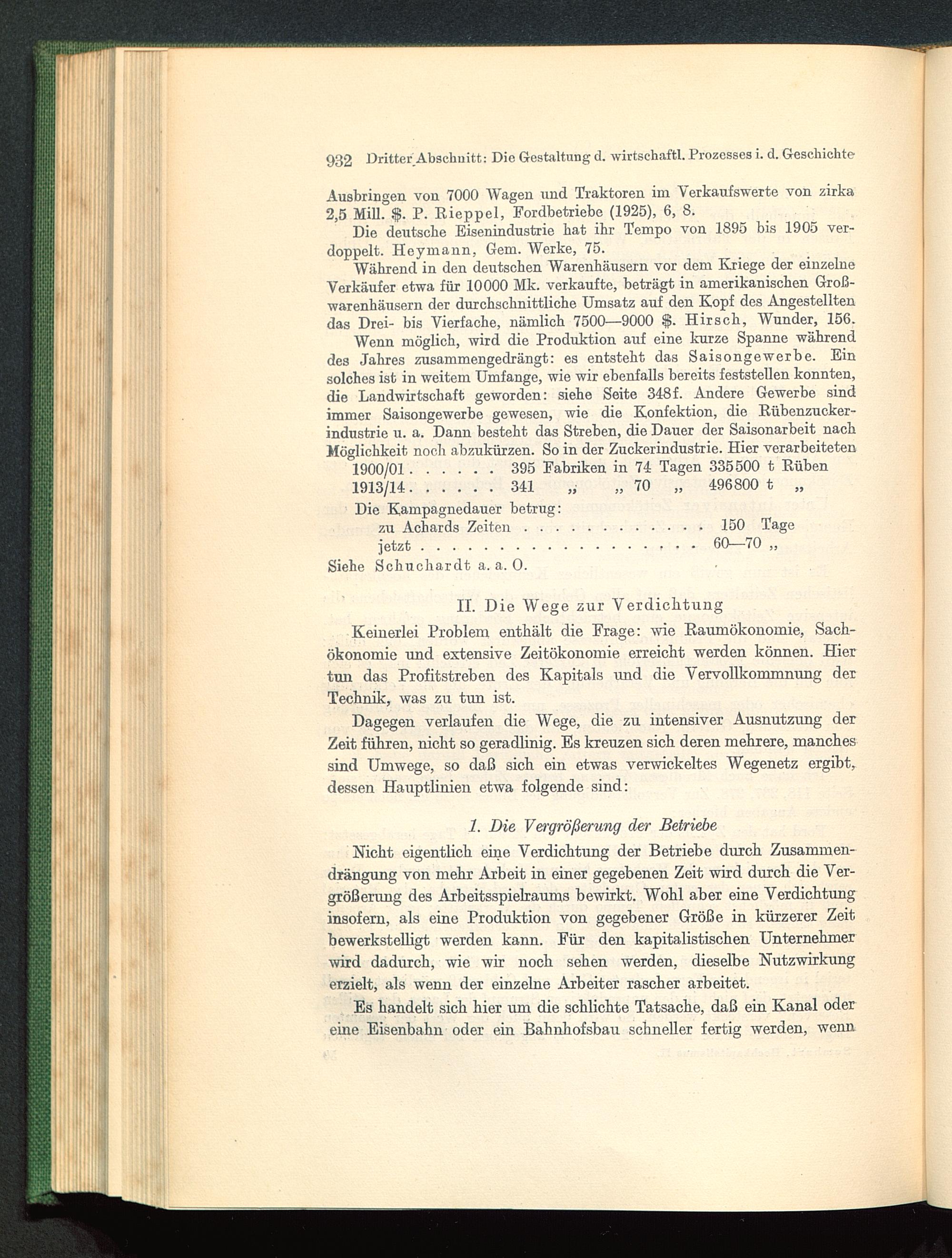 Nicht eigentlich eine Verdichtung der Betriebe durch Zusammen-drängung von mehr Arbeit in einer gegebenen Zeit wird durch die Ver-größerung des Arbeitsspielraums bewirkt. Wohl aber eine Verdichtunginsofern, als eine Produktion von gegebener Größe in kürzerer Zeitbewerkstelligt werden kann. Für den kapitalistischen Unternehmerwird dadurch, wie wir noch sehen werden, dieselbe Nutzwirkungerzielt, als wenn der einzelne Arbeiter rascher arbeitet.