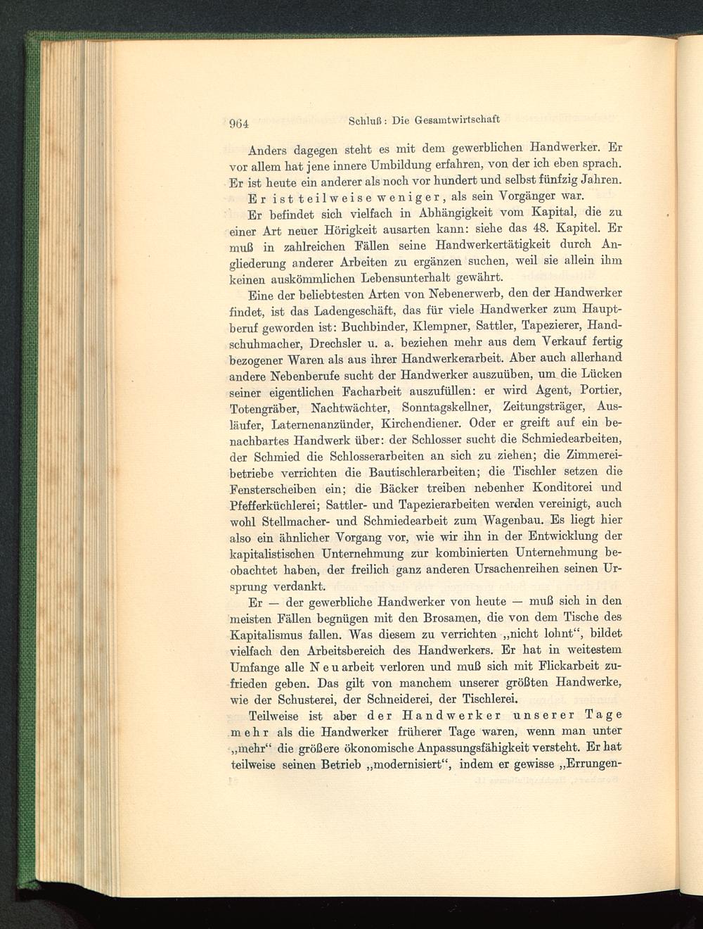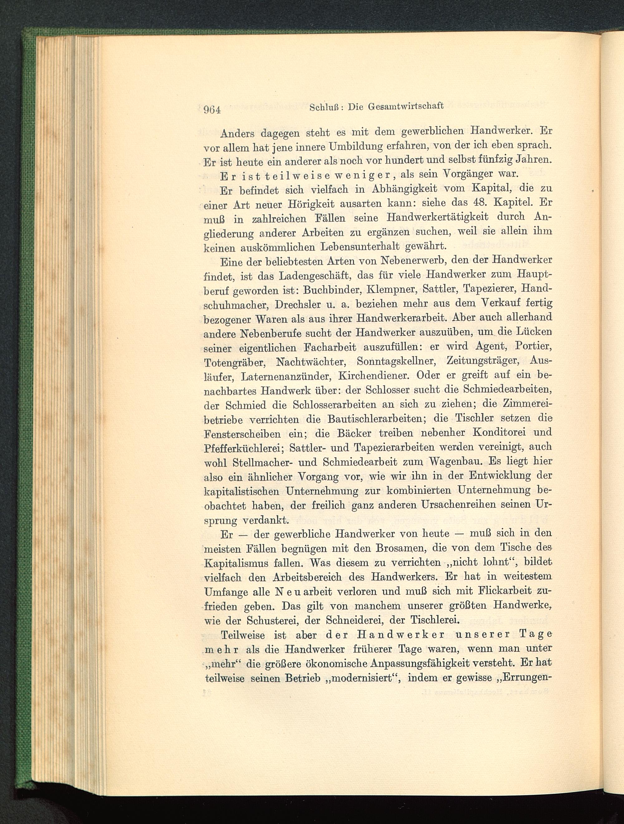 Er befindet sich vielfach in Abhängigkeit vom Kapital, die zueiner Art neuer Hörigkeit ausarten kann: siehe das 48. Kapitel. Ermuß in zahlreichen Fällen seine Handwerkertätigkeit durch An-gliederung anderer Arbeiten zu ergänzen suchen, weil sie allein ihmkeinen auskömmlichen Lebensunterhalt gewährt.