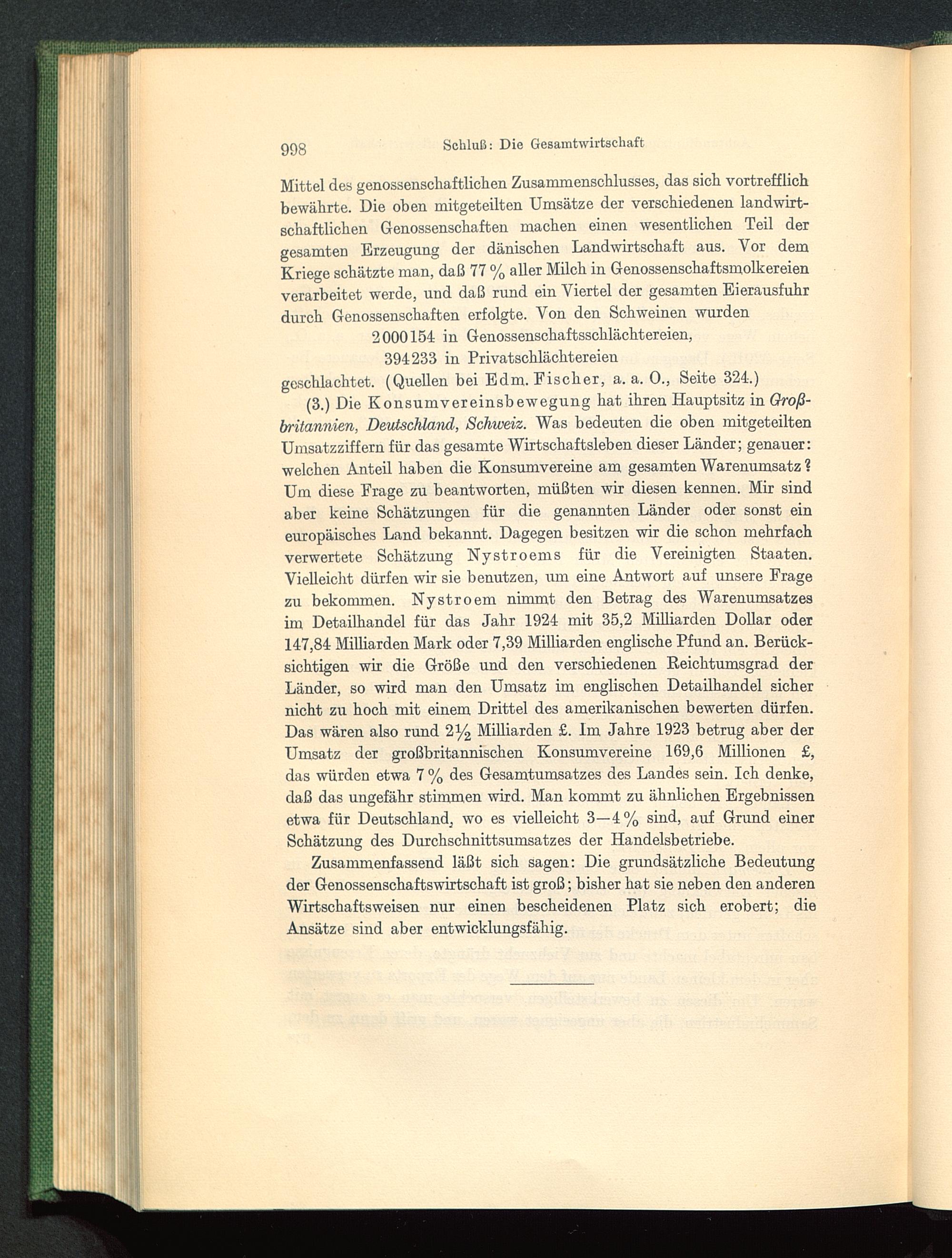 Zusammenfassend läßt sich sagen: Die grundsätzliche Bedeutungder Genossenschaftswirtschaft ist groß; bisher hat sie neben den anderenWirtschaftsweisen nur einen bescheidenen Platz sich erobert; dieAnsätze sind aber entwicklungsfähig.