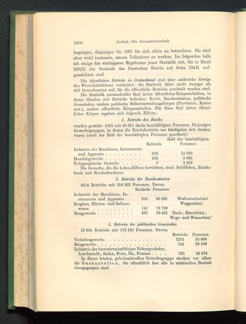 wurden gezählt: 1013 mit 40 311 darin beschäftigten Personen. DiejenigenGewerbegruppen, in denen die Reichsbetriebe am häufigsten sich fanden,waren (nach der Zahl der beschäftigten Personen geordnet):