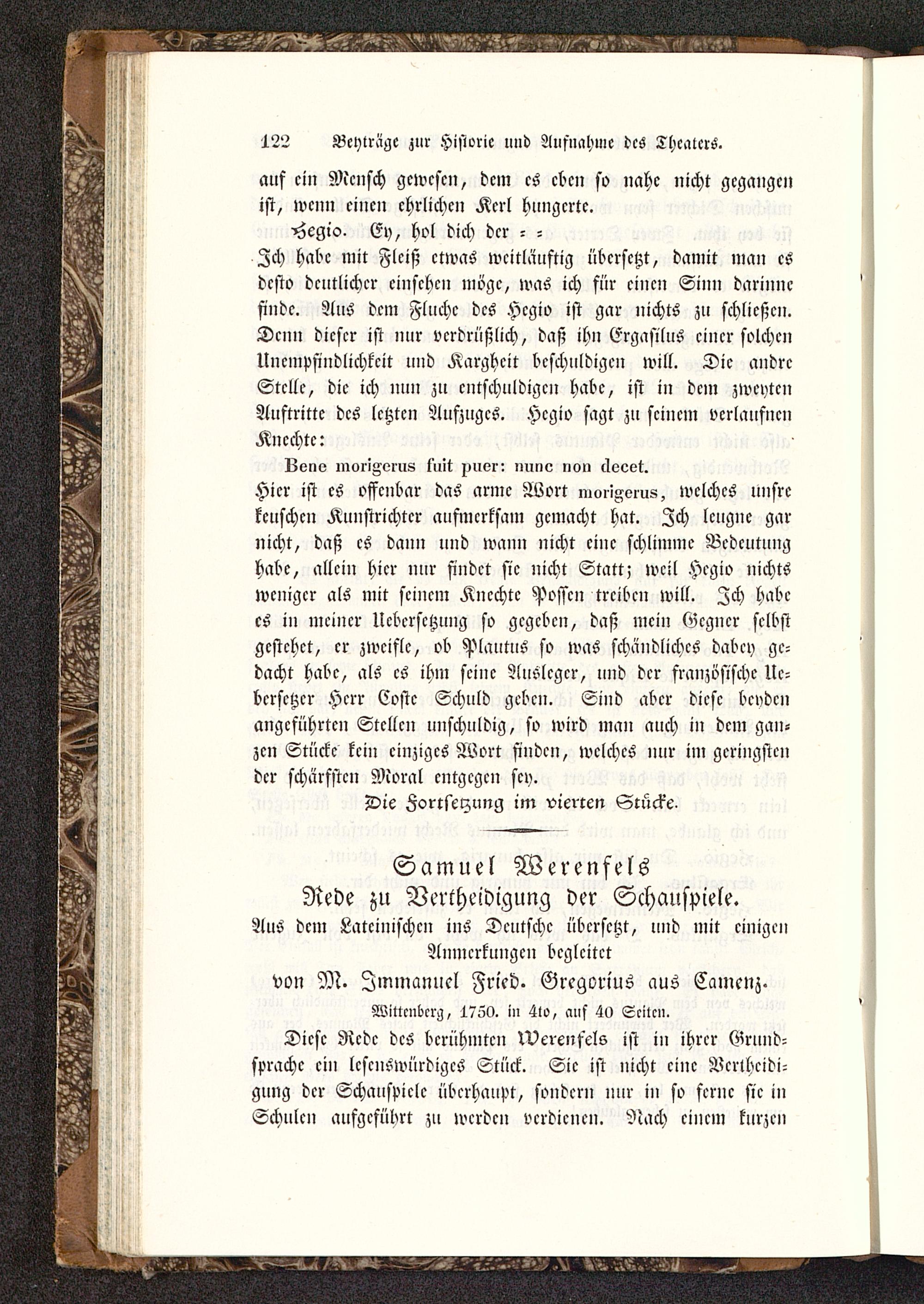 Hicr ist es offenbar das arme Wort moiiAerus, welches unsrekeuschen Kunstrichtcr aufmerksam gemacht hat. Zch leugne garnicht, daß es dann und wann nicht eine schlimme Bedeutunghabe, allein hicr nur findet sie nicht Statt; weil Hcgio nichtsweniger als mit scincm Kncchtc Possen treiben will. Ich habees in meiner Übersetzung so gegeben, daß mein Gegner selbstgestehet, er zweifle, ob PlautuS so was schändliches dabey ge-dacht habe, als es ihm seine Ausleger, und der französische Uc-bcrsctzcr Hcrr Costc Schuld geben. Sind aber diese bcpdcnangeführten Stellen unschuldig, so wird man auch in dcm gan-zen Stücke kein einziges Wort finden, welches nur im geringstender schärfsten Moral entgegen sey.