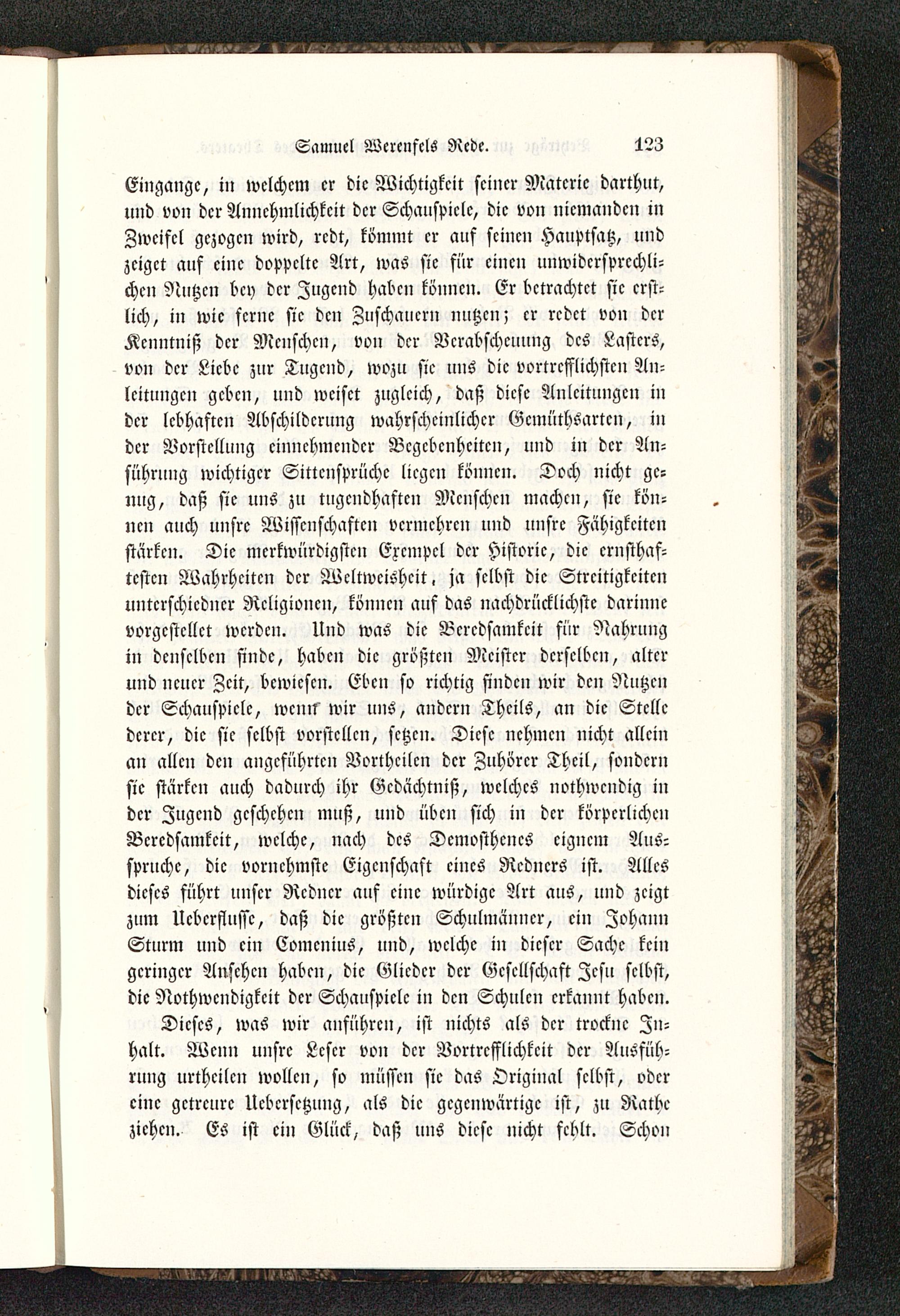 Eingänge, in welchem er die Wichtigkeit seiner Materie darthut,nnd von der Annehmlichkeit der Schauspiele, die von niemanden inZweifel gezogen wird, redt, kömmt er aus seinen Hauptsatz, undzeiget auf eine doppelte Art, was sie für einen uuwidcrsprcchli-chcn Nutzen bey der Jugend haben können. Er betrachtet sie erst-lich, in wie ferne sie den Zuschauern nutzen; cr redet von derKenntniß der Menschen, von der Vcrabschcuung des Lasters,von der Liebe zur Tugend, wozu sie uns die vortrefflichsten An-leitungen geben, und weiset zugleich, daß diese Anleitungen inder lebhaften Abschildcrung wahrscheinlicher Gemüthsarten, inder Vorstellung einnehmender Begebenheiten, und in der An-sührung wichtiger Sittcnsprüchc liegen können. Doch nicht ge-nug, daß sie uns zu tugendhaften Menschen machen, sie kön-nen auch unsre Wissenschaften vermehren und unsre Fähigkeitenstärken. Die merkwürdigsten Exempel der Historie, die ernsthaf-testen Wahrheiten der Wcltwcishcit, ja selbst die Streitigkeitennntcrschicdncr Religionen, können auf das nachdrücklichste darinncvorgestellet werden. Und was die Beredsamkeit für Nahrungin denselben finde, haben die größten Meister derselben, alterund neuer Zeit, bewiesen. Eben so richtig finden wir den Nutzender Schauspiele, wenn wir uns, andern Theils, an die Stellederer, die sie selbst vorstellen, setzen. Diese nehmen nicht alleinan allen den angeführten Vortheilen der Zuhörer Theil, sondernsie stärken auch dadurch ihr Gedächtniß, welches nothwendig inder Jugend geschehen muß, und üben sich in der körperlichenBeredsamkeit, welche, nach des Dcmosthcncs eignem Aus-spruchc, die vornehmste Eigenschaft eines Redners ist. Allesdieses führt unser Redner auf eine würdige Art aus, und zeigtzum Ucbcrflussc, daß die größte,: Schulmänner, ein JohannSturm und ein Comcnius, und, welche in dieser Sache keingeringer Ansehen haben, die Glieder der Gesellschaft Zcsu selbst,die Nothwendigkeit der Schauspiele in den Schulen erkannt haben.