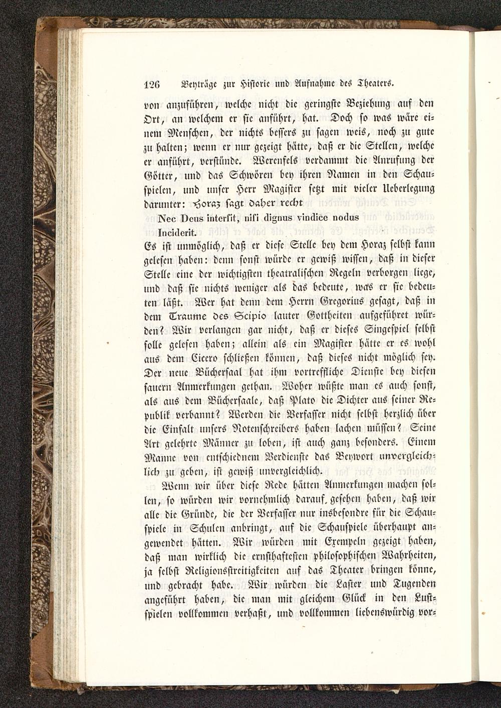 Es ist unmöglich, daß er diese Stelle bey dem Horaz selbst kanngelesen haben: denn sonst würde er gewiß wissen, daß in dieserStelle eine der wichtigsten theatralischen Regeln verborgen liege,und daß sie nichts weniger als das bedeute, was er sie bedeu-ten läßt. Wer hat denn dem Herrn Grcgorius gesagt, daß indem Traume des Scipio lauter Gottheiten aufgeführet wür-den? Wir verlangen gar nicht, daß er dieses Singcspicl selbstsolle gclcscn habcn; allein als ein Magister hätte er es wohlaus dem Cicero schließen können, daß dieses nicht möglich sey.Der ncuc Büchcrsaal hat ihm vortreffliche Dicnstc bcy diesensauern Anmerkungen gethan. Woher wüßte man es auch sonst,als aus dem Büchcrsaalc, daß Plato die Dichter aus seiner Re-publik verbannt? Wcrdcn dic Vcrfasscr nicht selbst herzlich überdie Einfalt unsers Notcnschrcibcrs haben lachen müssen? SeineArt gelehrte Männer zu loben, ist auch ganz besonders. EinemManne von cntschicdncm Ncrdicnstc das Bcowort unvergleich-lich zu gcbcn, ist gcwiß unvergleichlich.