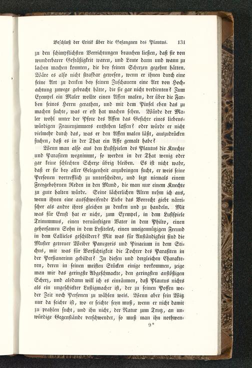 Wenn man also aus den Lustspielen des Plautus die Knechteund Parasiten wegnimmt, so werden in der That wenig odergar keine schlechten Scherze übrig bleiben. Es ist nicht wabr,daß cr sie bey aller Gelegenheit anzubringen sucht, cr weis seinePersonen vortrefflich zu unterscheiden, und legt niemals einemFrcvgcbohrncn Reden in den Mund, die man nur einem Knechtezu gute halten würde. Seine lächerlichen Alten nehm ich aus,wenn ihnen eine ausschweifende Liebe das Vorrecht giebt närri-scher als andre ihres gleichen zu denken und zu handeln. Mitwas für Ernst hat cr nicht, zum Exempel, in dem LustspieleTrinummus , cincn vcrnünftigcn Vatcr in dcm Philto, cincngehorsame» Sohn in dcm Lysitclcs, cincn uneigennützigen Freundin dem Ealliclcs geschildert? Mit was für Anständigkeit sind dieMuster getreuer Weiber Pancgyris und Pinacium in dcm Sti-chus, mit was für Vorsichtigkeit dic Tochter des Parasiten inder Persianern»! gebildet? Zn diesen und dergleichen Charakte-ren, deren in seinen meisten Stücken einige vorkommen, zeigeman mir das geringste Abgeschmackte, den geringsten anstößigenScherz, und alsdann will ich es einräumen, daß Plautus nichtsals ein ungeschickter Lustigmachcr ist, der zu seinen Possen we-der Zeit noch Personen zu wählen weis. Wcnn aber scin Witznur da scichtc ist, wo cr seichte scvn mnß, wcnn cr nicht damitzu prahlcn sucht, und ihn nicht, der Natur zum Trutz, an un-würdige Gegenstände vcrschwcndct, so mnß man ihn nothwcn-