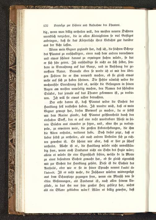 Der erste davon ist, daß Plautus wider die Einheit derHandlung soll verstoßen haben. Ich wundrc mich, daß es meinGegner gewagt hat, diesen Vorwurf zu machen, da cr selbstmit dem Racine glaubt, daß PlautnS größtcnthcils durch deneinfachen Stoff, den cr auf eine recht wunderbare Weise in sei-nen Stücken aus einander zu setzen, und, ohne ihn zu verdop-peln, zu erweitern weis, die großen Lobeserhebungen, die ihmdie Alten ertheilet, verdienet habe. Doch dieses zeigt, daß crlieber selbst zu urtheilen, als nach andern Urtheilen sich zu rich-ten gewohnt ist. Es scheint mir aber, daß cr hier zu scharfurtheilet. Wahr ist es, die Handlung würde nicht unvollstän-dig seyn, wenn auch Tyndarns nicht ein Sohn des Hcgio wäre;allein es würde ihr eine Eigenschaft fehlen, welche dc la Mottezu einer besondern Einheit gemacht hat, ob sie gleich eigentlichmit zur Einheit der Handlung gehört. Diese ist die Einheit desAntheils, oder wie cr sie in seiner Sprache nennet I'unit»; äsIintvi6t. Ist es nicht wahr, die Zuschauer würden misvcrgnügtaus dem Schauplätze gegangen seyn, wenn ein Mensch von soedlen Gesinnungen, als Tyndarus ist, nach allen seinem Un-glücke, in das ihn nur sein großes Herz gestürzt hat, nichtsals ciu Sklave geblieben wäre? Wäre es billig gewesen, daß