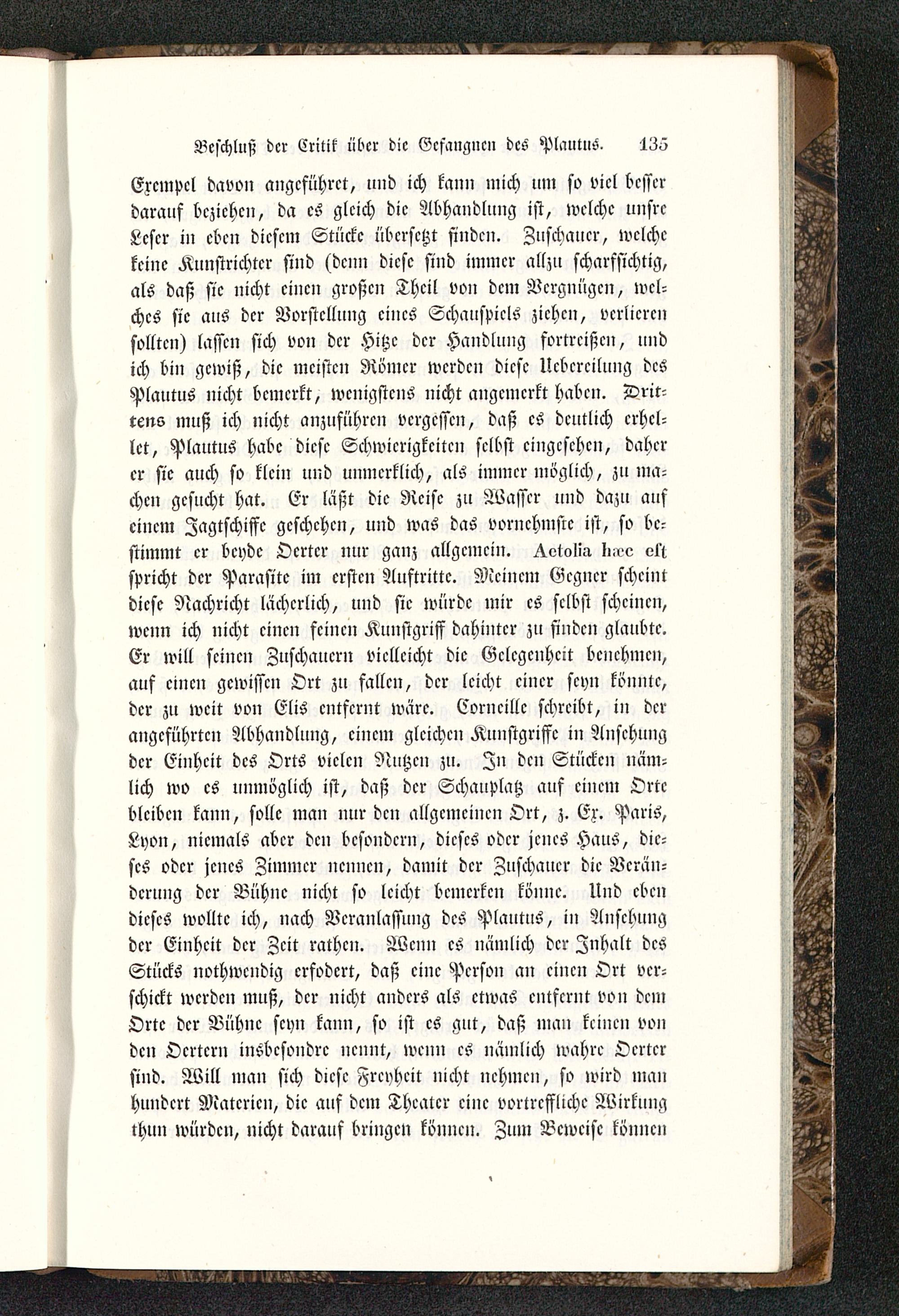 Ercmpcl davon angeführet, und ich kann mich »in so viel besserdarauf beziehen, da es gleich dic Abhandlung ist, welche unsreLeser in eben diesem Stücke übersetzt finden. Zuschauer, welchekeine Kunstlichter sind (denn diese sind immer allzu scharfsichtig,als daß sie nicht einen großen Theil von dem Vergnügen, wel-ches sie aus dcr Vorstellung eines Schauspiels ziehen, verlierensollten) lassen sich von der Hitze dcr Handlung fortreißen, undich bin gewiß, dic meisten Römer werden diese Ucbcrcilung dcSPlautus nicht bemerkt, wenigstens nicht angemerkt haben. Drit-tens muß ich nicht anzuführen vergessen, daß es deutlich erhel-let, Plautus habe diese Schwierigkeiten selbst eingesehen, daherer sie auch so klein und unmcrklich, als immer möglich, zuma-chen gesucht hat. Er läßt dic Reise zu Wasser und dazu aufeinem Zagtschiffc geschehen, und was das vornehmste ist, so be-stimmt er bcydc Ocrtcr nur ganz allgcmcin. ^vtoüa Iine oktspricht dcr Parasitc im ersten Auftritte. Meinem Gegner scheintdiese Nachricht lächerlich, und sie würde mir es selbst scheinen,wenn ich nicht einen feinen Kunstgriff dahinter zu finden glaubte.Er will seinen Zuschauern vielleicht dic Gelegenheit bcnchmc»,auf cincn gewissen Ort zn fallen, dcr lcicht einer seyn könnte,dcr zu weit von Elis entfernt wäre. Eorncillc schreibt, in dcrangcsührtcn Abhandlung, cincm gleichen Kunstgriffe in Ansehungdcr Einheit des Orts vielen Nutzen zu. Zn den Stücken näm-lich wo cs unmöglich ist, daß dcr Schauplatz auf einem Ortebleiben kann, solle man nur den allgemeinen Ort, z. Er. Paris ,Lyon, niemals aber den besondern, dieses oder jenes HauS, die-ses oder jenes Zimmer nennen, damit dcr Zuschauer dic Verän-derung der Bühne nicht so lcicht bcmcrkcn könne. Und ebendieses wollte ich, nach Veranlassung des Plautus , in Anscbungdcr Einhcit dcr Zeit rathen. Wenn cs nämlich dcr Inhalt dcsStücks nothwendig crfodert, daß eine Person an cincn Ort ver-schickt wcrdcn muß, dcr nicht andcrs als etwas entfernt von demOrte dcr Vühnc seyn kann, so ist cs gut, daß man keincn vondcn Ocrtcrn insbcsondrc ncnnt, wcnn cs nämlich wahre Ocrtcrsind. Will man sich dicsc Freyheit nicht nehmen, so wird mauhundert Materie», dic auf dcm Theater eine vortreffliche Wirkungthun würde», nicht darauf bringen können. Zum Beweise können