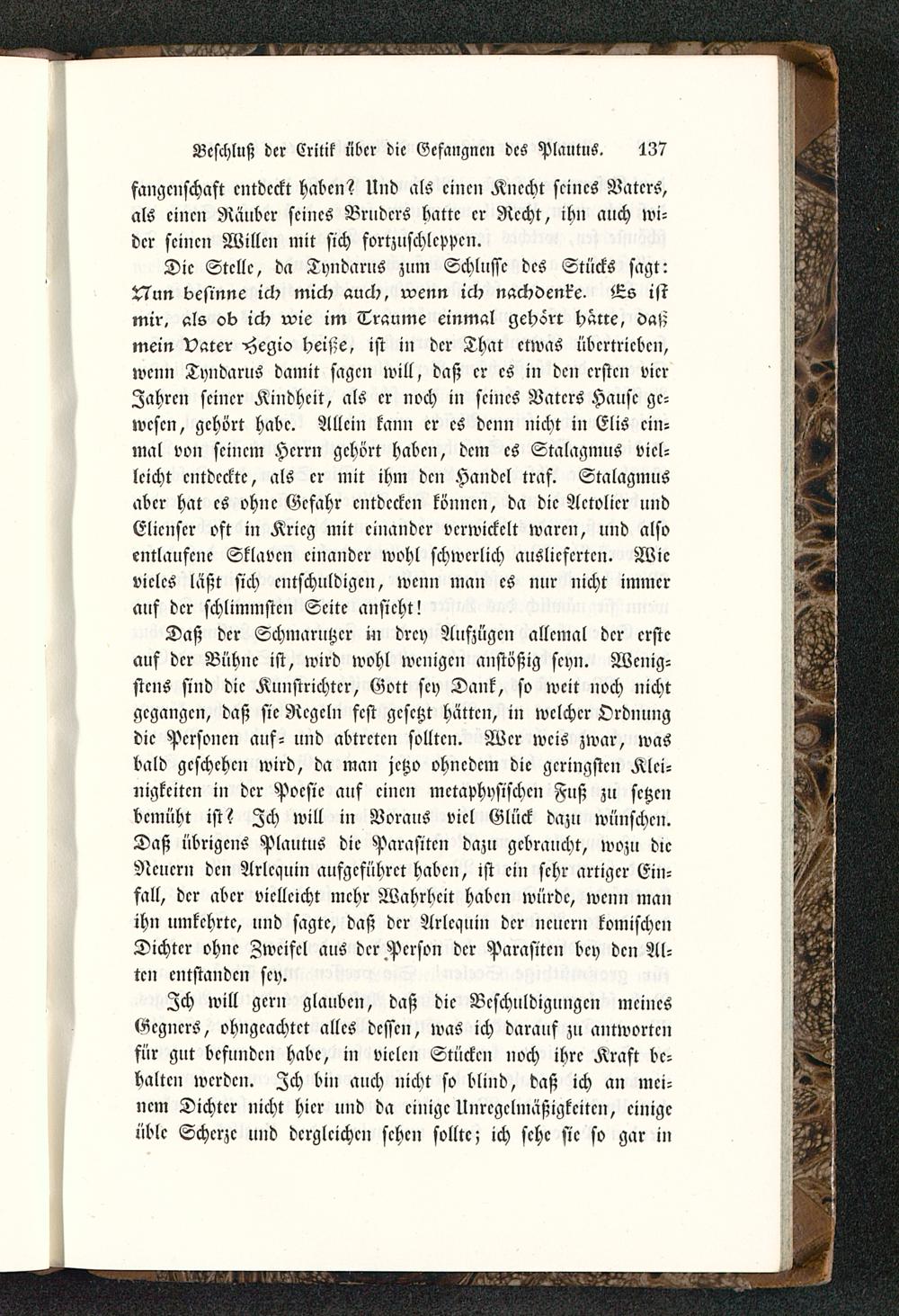 Daß der Schmarutzcr in drey Auszügen allemal der ersteauf der Bühne ist, wird wohl wenigen anstößig scyn. Wenig-stens sind dic Kuustrichtcr, Gott sey Dank, so weit noch nichtgegangen, daß sie Regeln fest gesetzt hatten, in welcher Ordnungdic Personen auf- und abtreten sollten. Wer weis zwar, wasbald geschehen wird, da man jctzo ohnedem dic geringsten Klei-nigkeiten in dcr Poesie auf einen metaphysischen Fuß zu setzenbemüht ist? Ich will in Voraus viel Glück dazu wünschen.Daß übrigens Plautus die Parasiten dazu gebraucht, wozu dlcNeuern den Arlcquin aufgeführet haben, ist ein sehr artiger Ein-fall, dcr aber vielleicht mehr Wahrheit haben würde, wen» manihn umkchrtc, und sagtc, daß dcr Arlcquin dcr neuern komischenDichter ohne Zweifel aus der.Person dcr Parasiten bey den Al-ten entstanden sey.