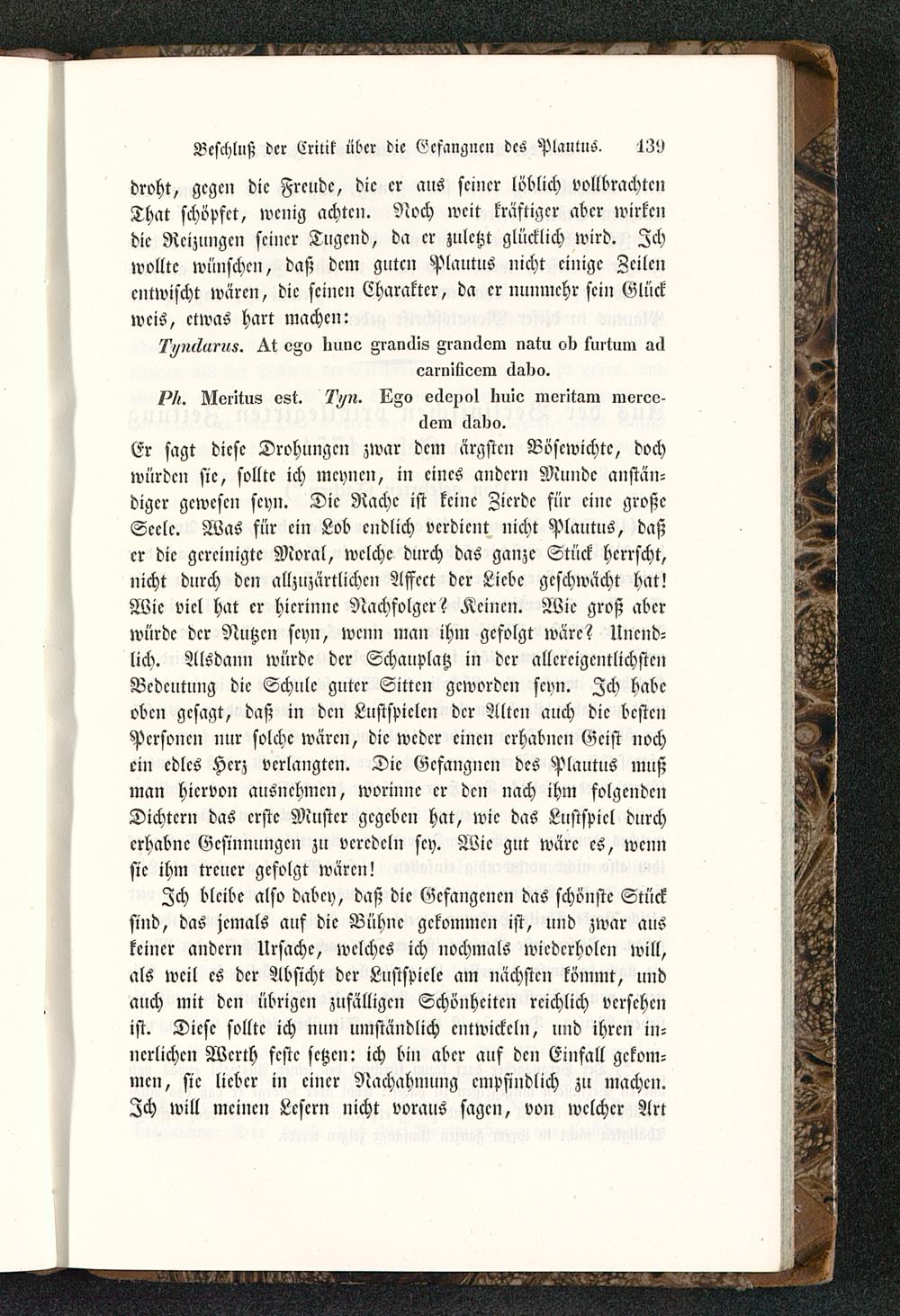 Er sagt diese Drohungen zwar dem ärgsten Böscwichtc, dochwürden sie, sollte ich meynen, in eines andern Munde anstän-diger gewesen seyn. Die Rache ist keine Zierde für eine großeSeele. Was für ein Lob endlich verdient nicht Plautus, daßer die gereinigte Moral, welche durch das ganze Stück herrscht,nicht durch den allzuzärtlichcn Affcct der Liebe geschwächt hat!Wie viel hat er hicrinnc Nachfolger? Keinen. Wie groß aberwürde der Nutzen seyn, wenn man ihm gefolgt wäre? Unend-lich. Alsdann würde der Schauplatz in der allcrcigcntlichstcnBedeutung die Schule guter Sitten geworden seyn. Ich habeoben gesagt, daß in den Lustspielen der Alten auch die bestenPersonen nur solche wären, die weder einen erhabnen Geist nochein edles Herz verlangten. Die Gefangnen des Plautus mußman hiervon ausnchmcn, worinnc er den nach ihm folgendenDichtern das erste Muster gegeben hat, wie das Lustspiel durcherhabne Gesinnungen zu veredeln sey. Wie gut wäre es, wennsie ihm treuer gefolgt wären!
