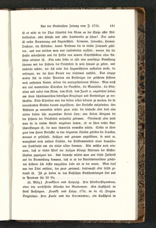 (6. März.) Frankfurt und Leipzig . Die weiberstipendicn/oder die wohlfeile Miethe der Studenten- Ein Lustspiel infünf Auszügen. Franr'f- und Leipz- 1751. in 8t- Bogen-Desgleichen: Der Faule und die Vormünder, ein Lustspiel in