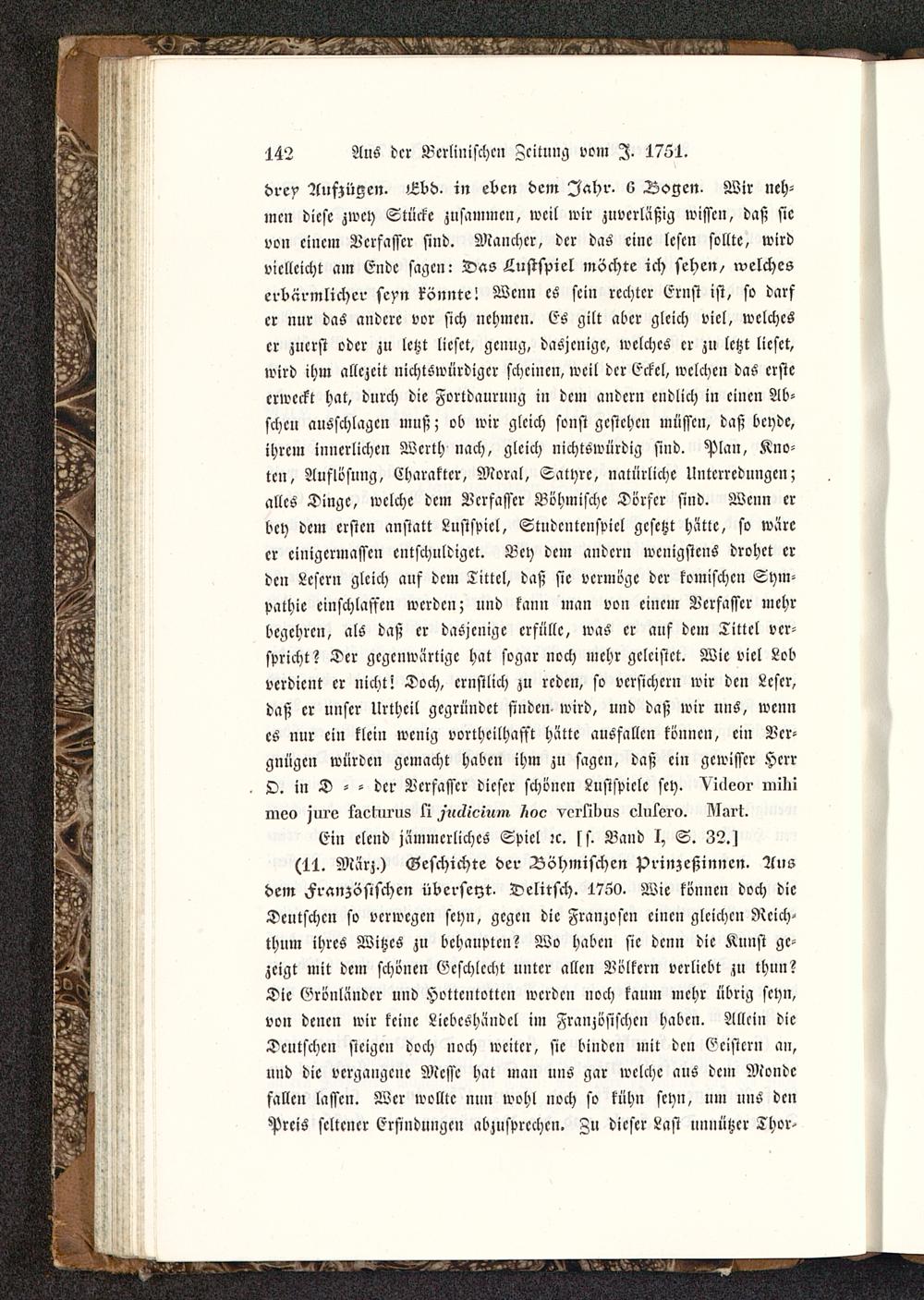 drey Auszügen. U5bd. in eben dem Jahr- L Logen. Wir neh-men diese zwey Stücke zusammen, weil wir znvcrläßig wissen, daß sievon einem Verfasser sind. Mancher, der das eine lesen sollte, wirdvielleicht am Ende sagen - Das Lustspiel möchte ich sehen / welcheserbärmlicher seyn könnte! Wenn es sein rechter Ernst ist, so darfer nur das andere vor sich nehmen. Es gilt aber gleich viel, welcheser zuerst oder zu letzt licsct, genug, dasjenige, welches er zu letzt liefet,wird ihm allezeit nichtSwürdigcr scheinen, weil der Eckcl, welchen das ersteerweckt hat, durch die Fortdaurung in dem andern endlich in einen Ab-scheu auSschlagcn muß; ob wir gleich sonst gestehen müssen, daß beyde,ihrem innerlichen Werth nach, gleich nichtswürdig sind. Plan, Kno-ten, Auflösung, Charakter, Moral, Satyre, natürliche Unterredungen;alles Dinge, welche dem Verfasser Böhmische Dörfer sind. Wenn erbey dem ersten anstatt Lustspiel, Studcntcnspicl gesetzt hatte, so wäreer einigermassen entschuldiget. Bey dem andern wenigstens drohet erden Lesern gleich auf dem Tittel, daß sie vermöge der komischen Sym-pathie cinschlasscn werden; und kann man von einem Verfasser mehrbegehren, als daß er dasjenige erfülle, was er auf dem Tittel ver-spricht? Der gegenwärtige hat sogar noch mehr geleistet. Wie viel Lobverdient er nicht! Doch, ernstlich zu reden, so versichern wir den Leser,daß er unser Urtheil gegründet finden wird, und daß wir uus, wennes nur ein klein wenig vorthcilhafft hätte ausfallen tonnen, ein Ver-gnügen würden gemacht haben ihm zn sagen, daß ein gewisser HerrO. in D - - der Verfasser dieser schönen Lustspiele sey. Vicleor miliimoo jnio iaeliri'us ti ^'«l?ic«iM /ioo vei'lilius clulero. Ui>rt.Ein elend jämmerliches Spiel :c. ss. Band I, S. 32.1(11. März.) Geschichte der Böhmischen prinzeßinncn- Ausdem Französischen übersetzt. Delitsch. 17Z0. Wie können doch dieDeutschen so verwegen seyn, gegen die Franzosen einen gleichen Reich-thum ihres Witzes zu behaupten? Wo haben sie denn die Kunst ge-zeigt mit dem schönen Geschlecht unter allen Völkern verliebt zu thun?Die Grönländer und Hottentotten werden noch kaum mehr übrig seyn,von denen wir keine Licbcshänocl im Französischen haben. Allein dieDeutschen steigen doch noch weiter, sie binden mit den Geistern an,und die vergangene Messe hat man uns gar welche aus dem Mondefallen lassen. Wer wollte nun wohl noch so kühn seyn, um uns denPreis seltener Erfindungen abzusprechen. Zu dieser Last nnnützcr Thor-