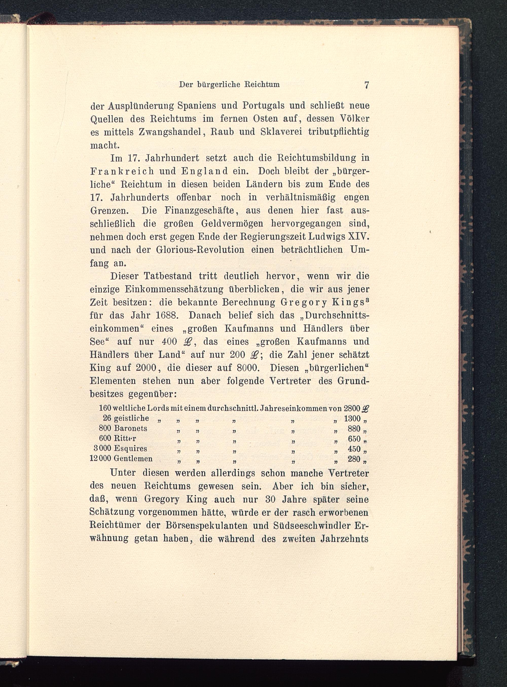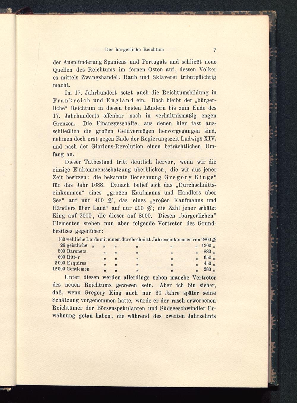 Dieser Tatbestand tritt deutlich hervor, wenn wir dieeinzige Einkommensschätzung überblicken, die wir aus jenerZeit besitzen: die bekannte Berechnung Gregory Kings 8für das Jahr 1688. Danach belief sich das „Durchschnitts-einkommen“ eines „großen Kaufmanns und Händlers überSee“ auf nur 400 das eines „großen Kaufmanns undHändlers über Land“ auf nur 200 j£; die Zahl jener schätztKing auf 2000, die dieser auf 8000. Diesen „bürgerlichen“Elementen stehen nun aber folgende Vertreter des Grund-besitzes gegenüber: