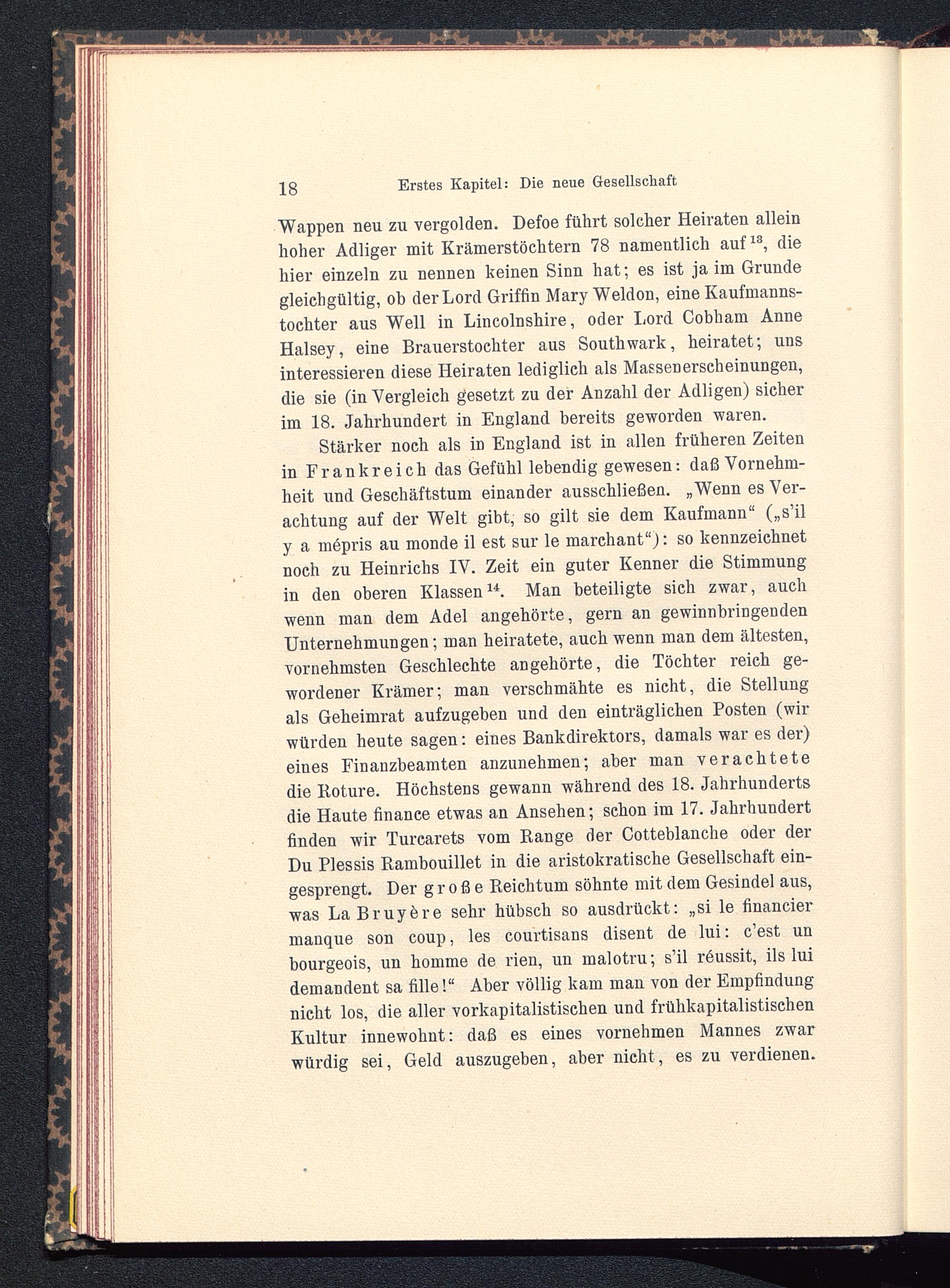 Stärker noch als in England ist in allen früheren Zeitenin Frankreich das Gefühl lebendig gewesen: daß Vornehm-heit und Geschäftstum einander ausschließen. „Wenn es Ver-achtung auf der Welt gibt, so gilt sie dem Kaufmann“ („s’ily a möpris au monde il est sur le marchant“): so kennzeichnetnoch zu Heinrichs IV. Zeit ein guter Kenner die Stimmungin den oberen Klassen 14 . Man beteiligte sich zwar, auchwenn man dem Adel angehörte, gern an gewinnbringendenUnternehmungen; man heiratete, auch wenn man dem ältesten,vornehmsten Geschlechte angehörte, die Töchter reich ge-wordener Krämer; man verschmähte es nicht, die Stellungals Geheimrat aufzugeben und den einträglichen Posten (wirwürden heute sagen: eines Bankdirektors, damals war es der)eines Finanzheamten anzunehmen; aber man verachtetedie Roture. Höchstens gewann während des 18. Jahrhundertsdie Haute finance etwas an Ansehen; schon im 17. Jahrhundertfinden wir Turcarets vom Range der Cotteblanche oder derDu Plessis Rambouillet in die aristokratische Gesellschaft ein-gesprengt. Der große Reichtum söhnte mit dem Gesindel aus,was LaBruybre sehr hübsch so ausdrückt: „si le financiermanque son coup, les courtisans disent de lui: c’est unbourgeois, un homme de rien, un malotru; s’il röussit, ils luidemandent sa fille!“ Aber völlig kam man von der Empfindungnicht los, die aller vorkapitalistischen und frühkapitalistischenKultur innewohnt: daß es eines vornehmen Mannes zwarwürdig sei, Geld auszugeben, aber nicht, es zu verdienen.